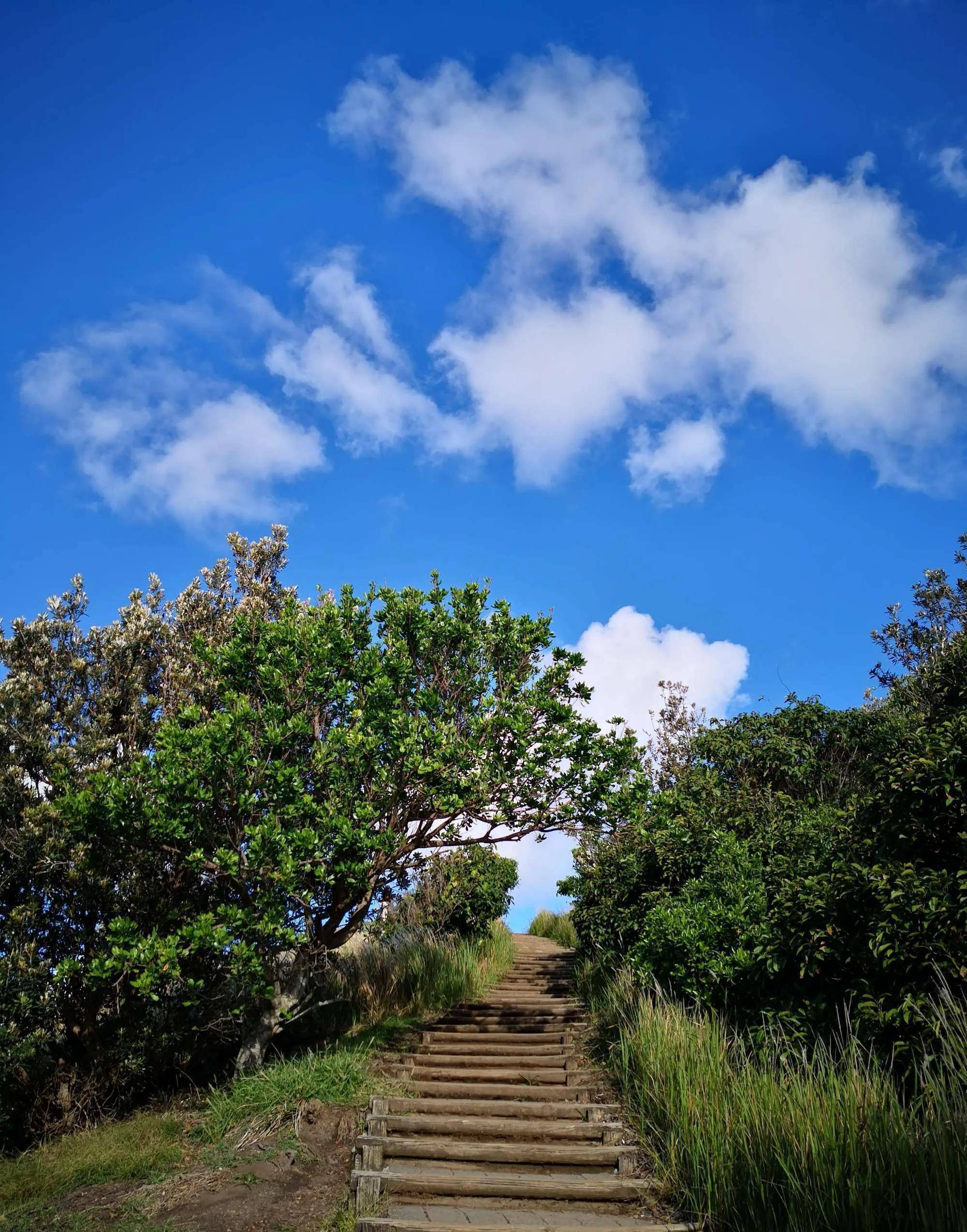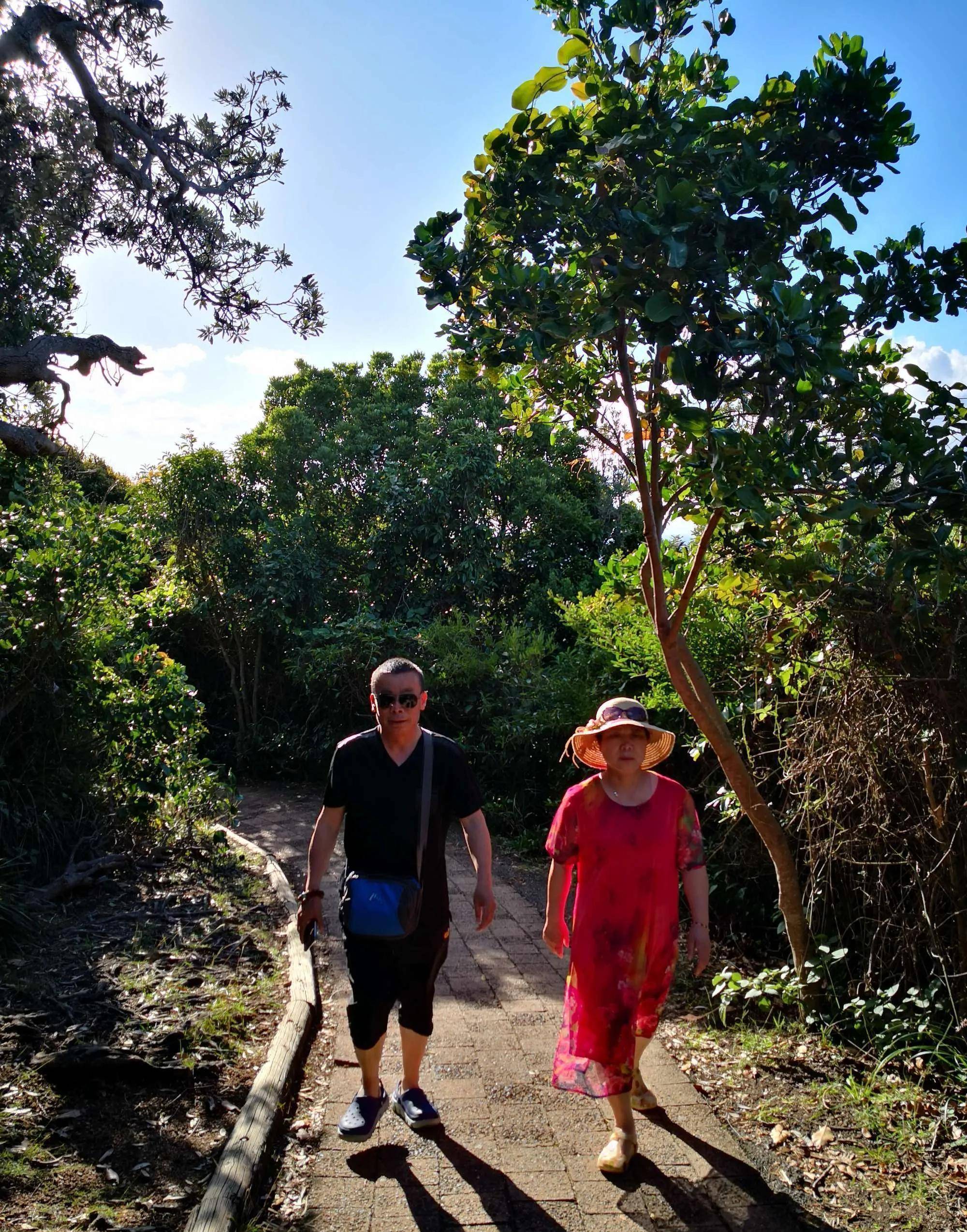 我们沿着山脚下的登山栈道一路徒步上山,栈道的左面是大海、蓝天、白云,右面是雨林、茅草、棕树,海风拂面,涛声拍岸,我们一路感叹着大自然的美妙。
