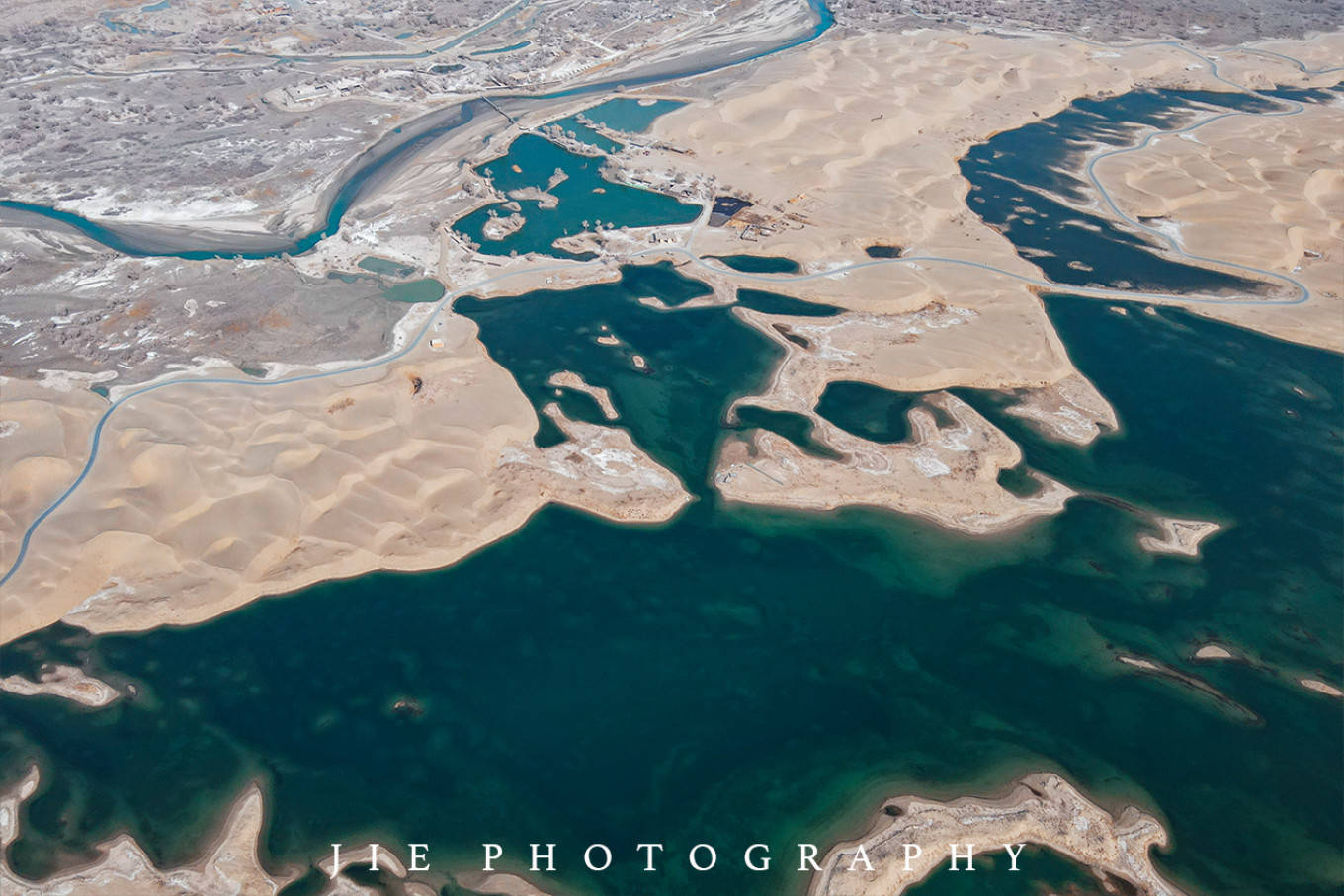 罗布人村寨距离 库尔勒 市区不到100公里,景区包括沙漠、 塔里 木河、胡杨林等景观。若在 塔里 木河丰水期,可以看到最长的内陆河、最大的沙漠与广阔的胡杨林相映的多彩画面。初到罗布人村寨,一路上没有任何遮挡的暴晒和目光所及之处的枯树,让我有一种置身 纳米比亚 荒野的感觉。直到我们步行1公里,终于看到了沙漠中的一汪水。枯水期的 塔里 木河水缓缓流淌,如果闭上眼听,它流淌得似乎有些“声嘶力竭”,反倒是湖里的天鹅个个精神饱满。不由分说,无人机就飞了起来。我盯着显示屏看,错愕惊叹,绿洲像宝石一样,如同翡翠镶嵌在沙漠,职业病的我都想赶快导出来照片发两张。