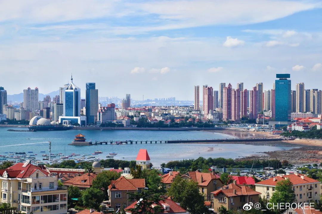 燕儿岛山公园地处浮山湾东端,一边是蜿蜒起伏的海岸线,一边是城市高楼大厦,时尚繁华和自然景色完美地融合在一起。