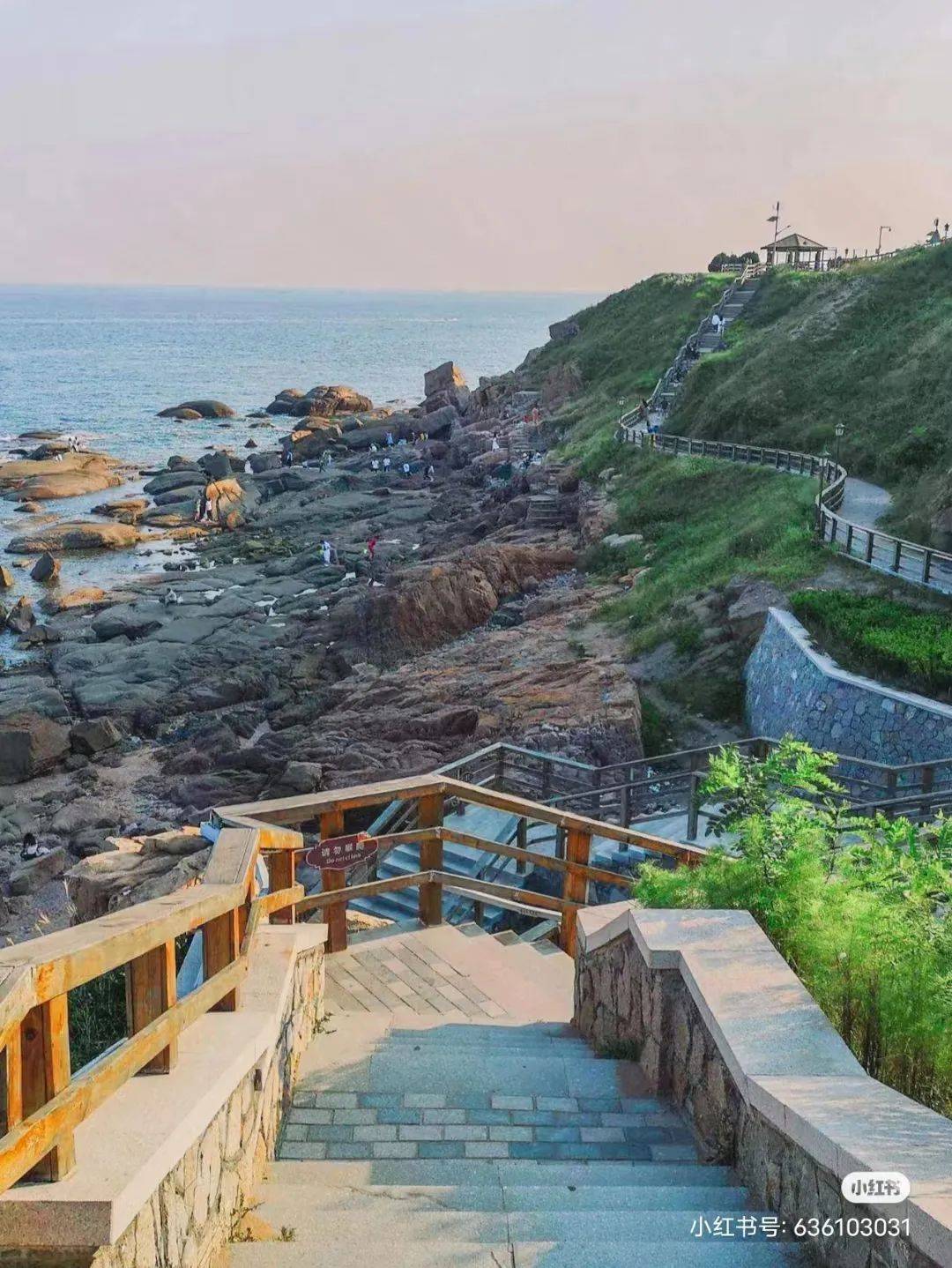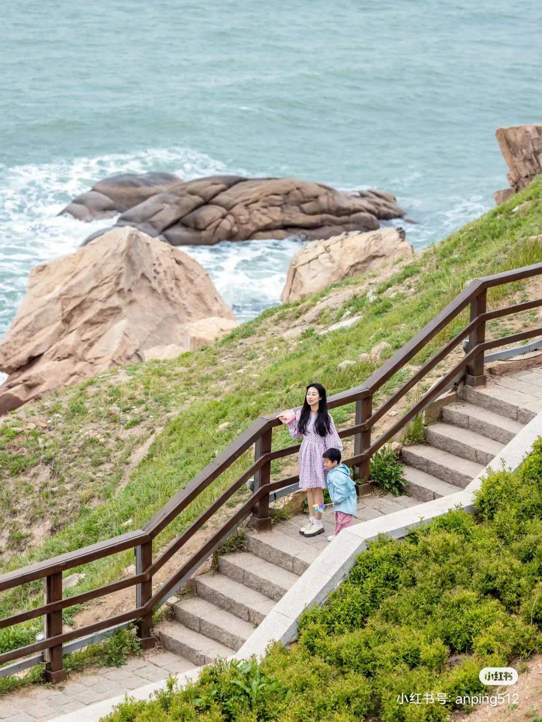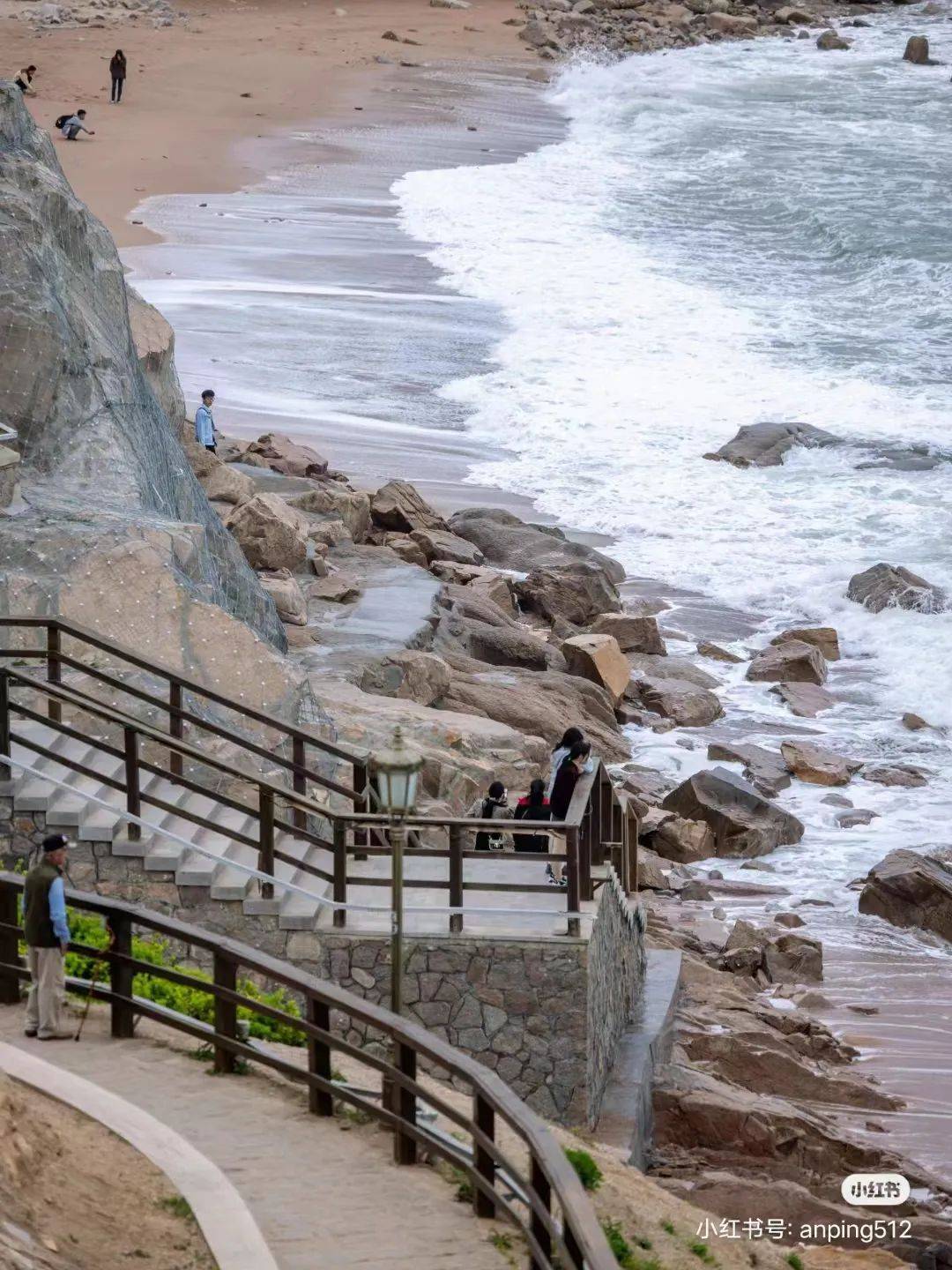 浪花阵阵拍打着礁石,随山依势而建的木栈道映入眼帘,木栈道与阶梯相连,大海与峭壁相互映衬,赋予了燕儿岛山公园浪漫气质。