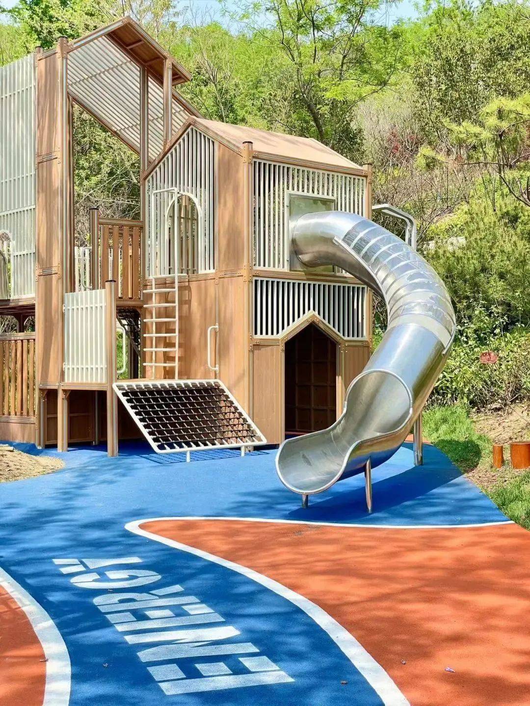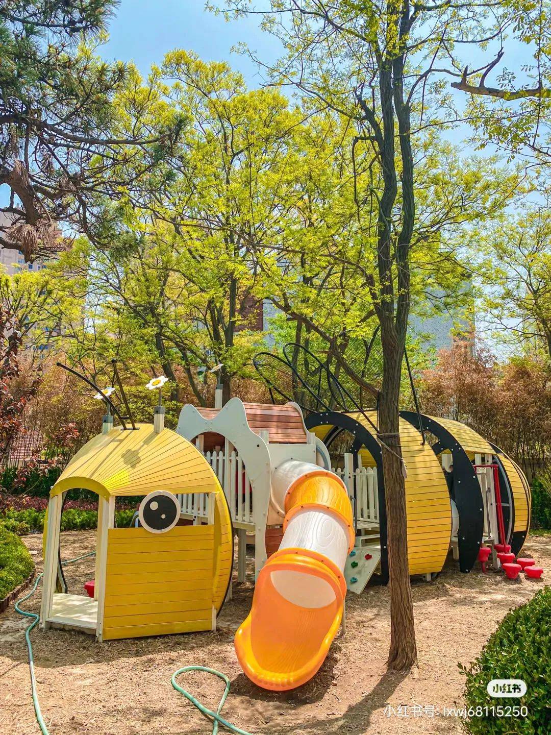 这里有许多游乐设施,蜜蜂滑梯、沙坑、秋千、蹦蹦床、攀岩场地、篮球场……可以随心玩。