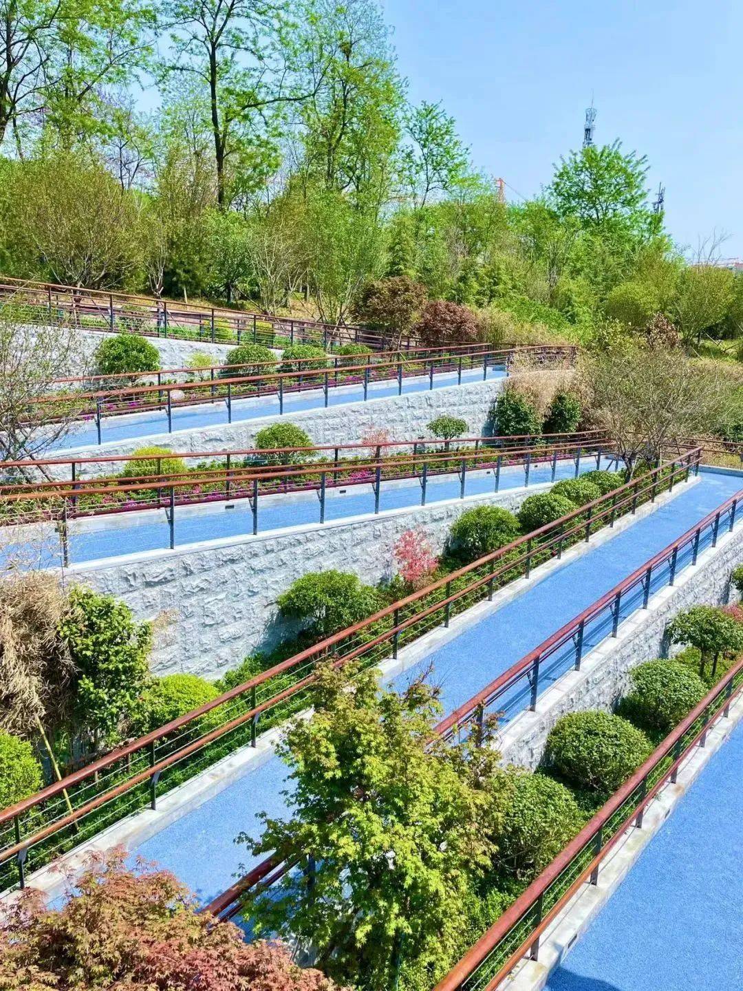 在榉林公园段远眺,高大的电视塔就静静伫立在眼前。绿树环绕的山林中,一道彩虹栈道看起来格外灵动。