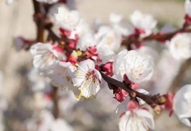 三月底、四月初,正是杏花开放是时节,杏花之美虽有“看红不看白”之说,但其实各阶段各有风韵。饱蕾未放时之蓄红,称"红蜡半含萼";初放时变浅而成淡粉,“粉薄红轻掩羞,含蕊忙护胭脂色”;待到完全盛开,则是“团枝繁盛,盈盈似雪”之态(山杏则以粉红居多)。 杏花开时常常伴有春雨飘落,让人不由得会联想起“小楼一夜听春雨,深巷明朝卖杏花”的美丽诗句。