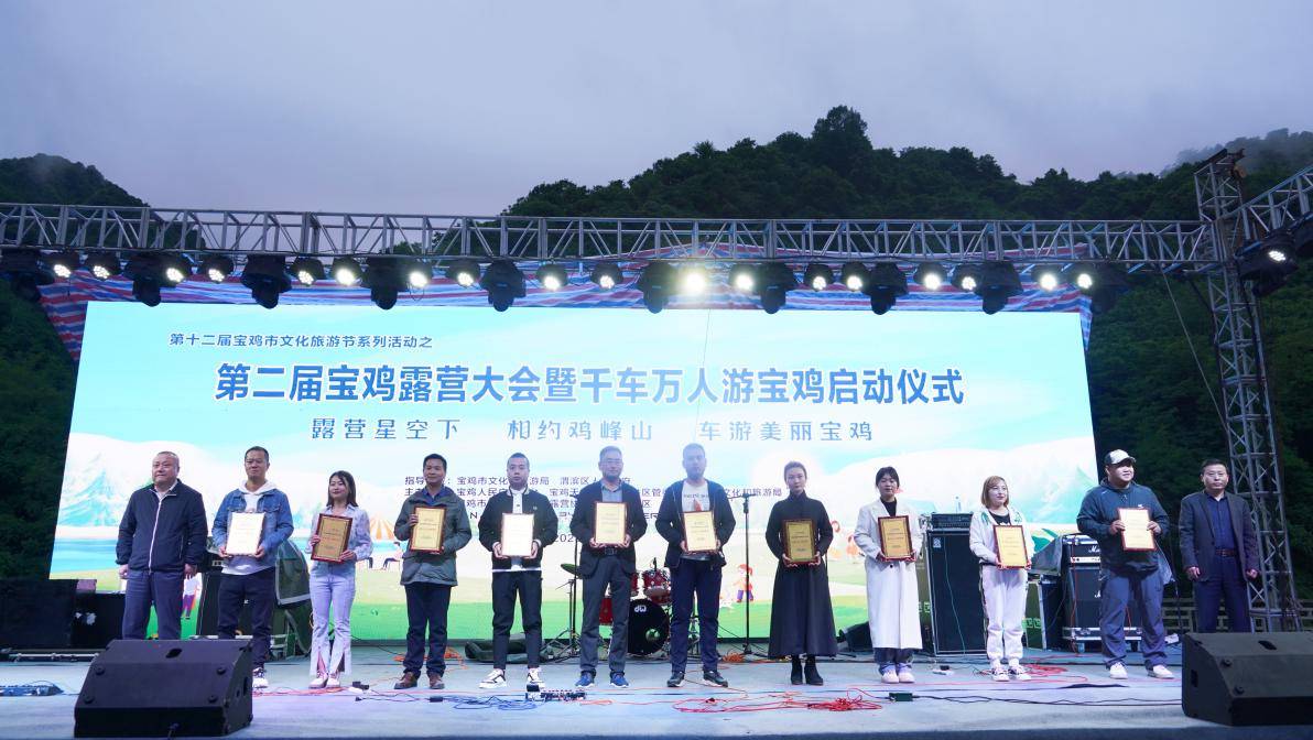 活动现场,宝鸡天台山风景名胜区管委会主任刘晓明推介了鸡峰山露营、如意茵香文旅产品;宝鸡人民广播电台交通旅游广播主持人宣读了“千车万人游宝鸡”文明自驾游、文明露营倡议书;宝鸡市自驾游及房车露营协会会长李涛公布了宝鸡户外十大露营基地入选名单;宝鸡市文化和旅游局党组成员、二级调研员王光友和育才集团党委书记、董事长史军辉为宝鸡户外十大露营基地单位授牌;宝鸡人民广播电台台长刘新虎为“千车万人游宝鸡”车队代表授旗。