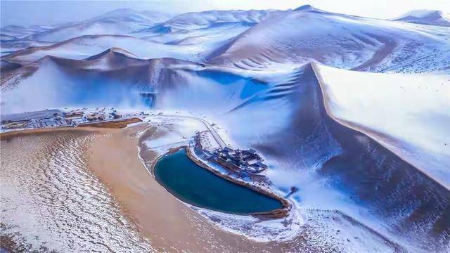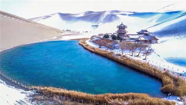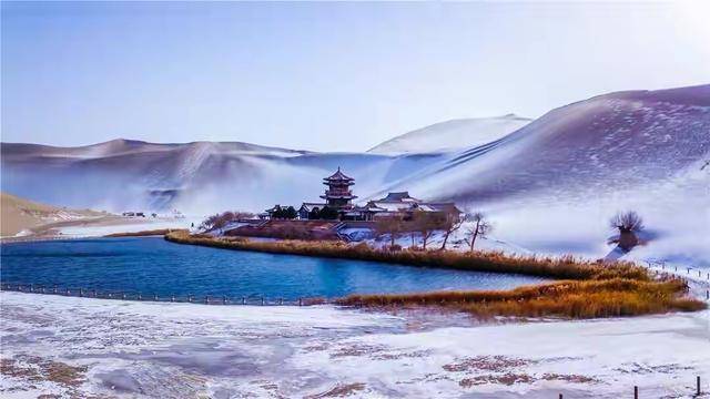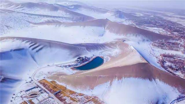 敦煌的雪最美,美在千年古泉(月牙泉)雪后月牙泉,千里冰封,万里飘雪,视野广阔,大气、分外妖娆,雪后初晴,鸣沙山月牙泉景区沙雪交融,雪景美如画。