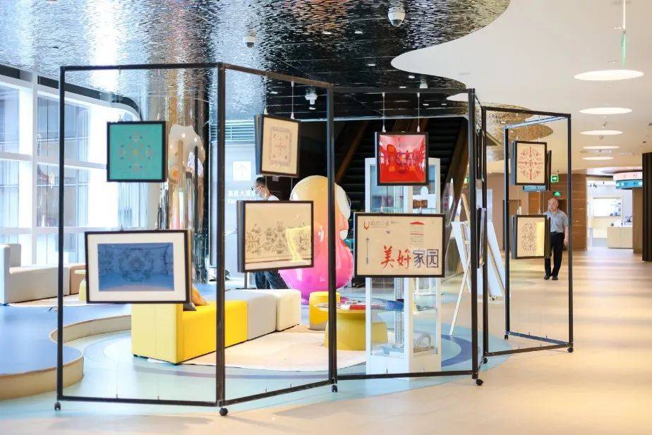 二楼的“美好社区会客厅”营造了一个供公众休憩、交流、观赏的公共空间。落地展架上悬挂着一幅幅上海市非物质文化遗产“罗泾镇十字挑花”,它们是“美好家园行动者”海上御景苑十字挑花团队的作品。