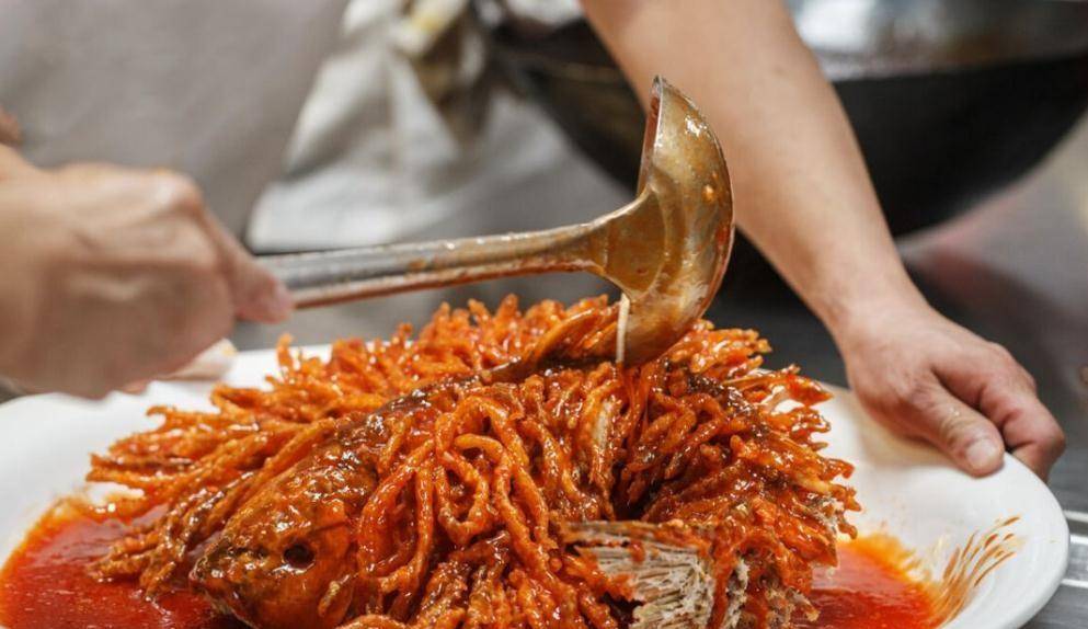用剪刀将鲤鱼剪成细丝炸胡,再把玉兰片和火腿丝烹炒淋芡浇到鱼身,做好的鱼丝蓬松如狮子,色泽金黄,吃起来味道也是酸甜可口。