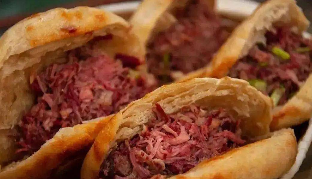 它是用满满的驴肉馅用缸炉烧饼包裹起来,做成馅饼,煎至两面金黄,咬上一口,浓浓的驴肉馅儿香味十足,真的是很过瘾!