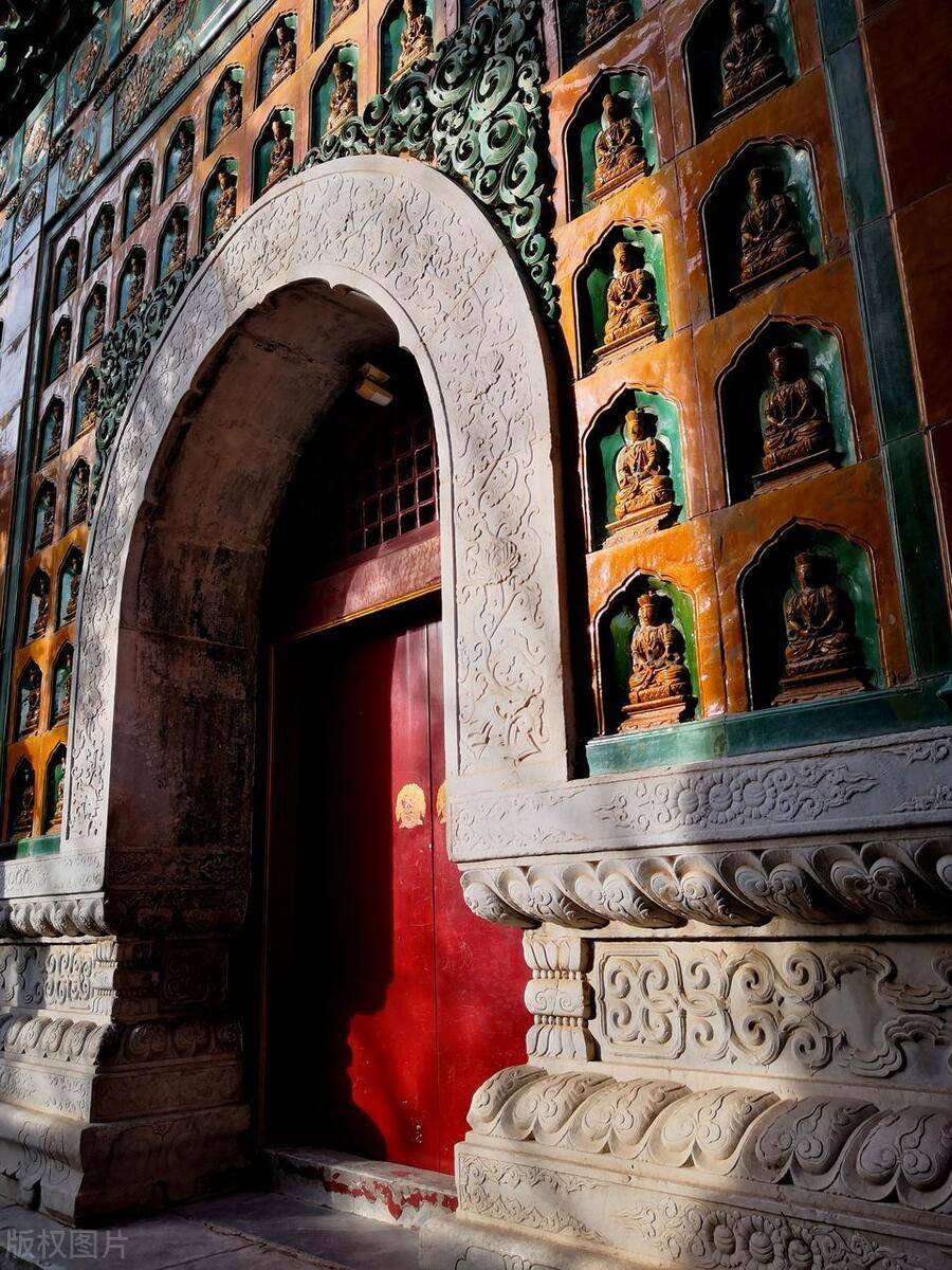 四面墙上有着成千上万个小佛像,让我们感到十分好奇。当我们仔细观察时,发现每块琉璃砖上雕刻的每一尊佛像都盘腿打坐,双掌合十,慈眉善目,活生生的就像是在向我们微笑。