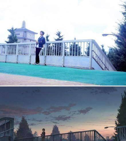 还有这个泷独自在天桥上思念三叶的场景,wuli小凯也是神还原出来,虽然天色不太一样,但是还是很有感觉的,小凯也是像极了漫画中的翩翩美少年。