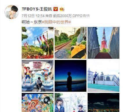 7月12日,王俊凯发布了一组九宫格照片记录自己的东京游。从照片中可以看出,小凯是一个不折不扣的动漫迷,记录的景色都是和动漫相关的,这是小凯眼中的东京。