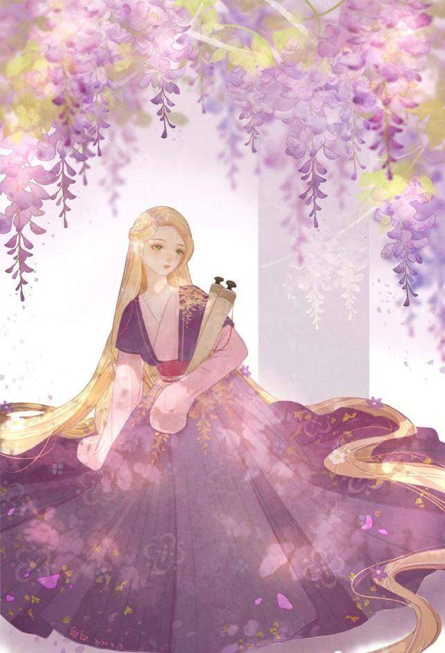 古代才女讲究琴棋书画。看来长发公主长发公主应该更会画画。她手里拿着两个面包卷,坐在地板上。头上的紫花与整体的汉服色相得益彰。这是什么花?蓝雨?看上去不错。
