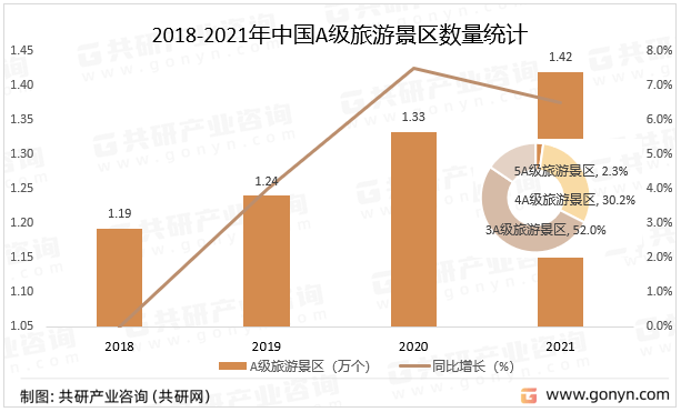 我国疆域辽阔,地域地势繁杂不一,风景各异,拥有悠久的发展历史,使得我国旅游资源数量和品位均在全球名列前茅,截止2021年末我国共有A级旅游景区1.42万个,其中,5A级旅游景区302个,4A级旅游景区4030个和3A级旅游景区6931个。