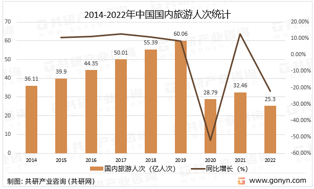 近年来我国经济高速发展,人民的收入水平不断攀升,大多已达到或即将达到小康社会,随着可支配收入的提升,生活方式也发生了翻天覆地的变化,从以简单的物质追求逐渐向对精神文化的享受过渡,旅游因具有赏心悦目、文化感受的双重优势,便当之无愧地成为了大多数人的生活必需品,加之新一代年轻人的独立,以其前沿的思想和深受西方先进社会的影响,外出旅游逐渐成为了社会新时尚,2019年我国国内旅游人次达60.06亿人次,同比增长8.43%,受新冠肺炎疫情影响,自2020年我国国内旅游人次下滑明显,2021年小幅回升,2022年我国国内旅游人次共计25.3亿人次,同比减少22.1%。