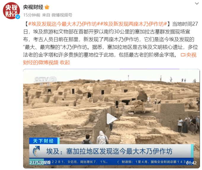 当地时间27日,埃及旅游和文物部在首都开罗以南约30公里的塞加拉古墓群发掘现场宣布,考古人员日前在那里,新发现了两座木乃伊作坊,它们是迄今埃及发现的“最大、最完整的”木乃伊作坊。据悉,塞加拉地区是古埃及文明核心遗址,多位法老的金字塔和许多贵族的墓地位于此地,包括最古老的阶梯金字塔。