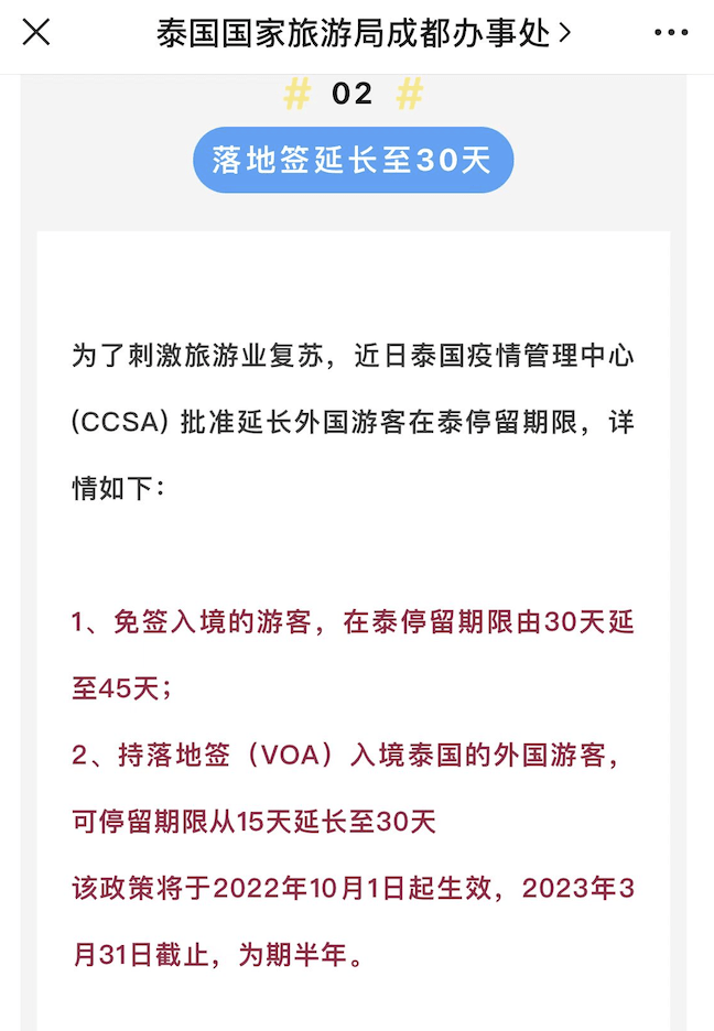 另据封面新闻记者了解,泰国对部分国际游客实施的45天免签证和30天落地签证临时政策于当地时间3月31日截止。2022年9月,为刺激旅游业复苏,泰国疫情管理中心批准延长外国游客在泰停留期限,自2022年10月1日至2023年3月31日,免签入境的游客,在泰停留期限由30天延至45天。落地签入境泰国的外国游客,可停留期限从15天延长至30天。目前,泰国恢复30天免签和15天落地签政策。