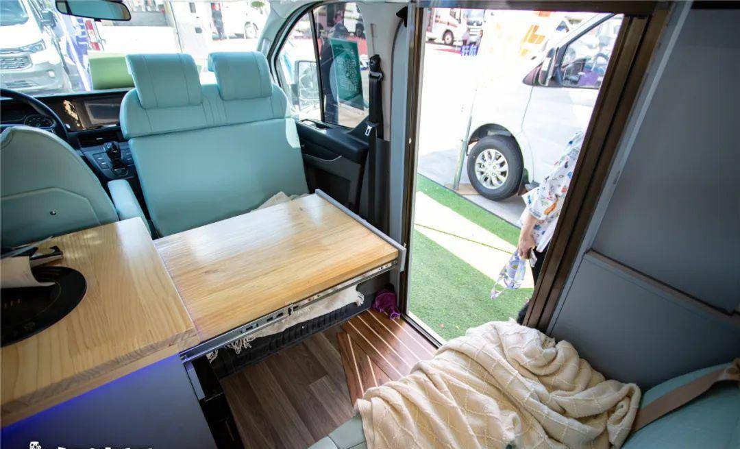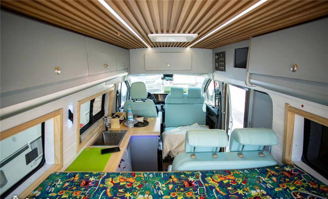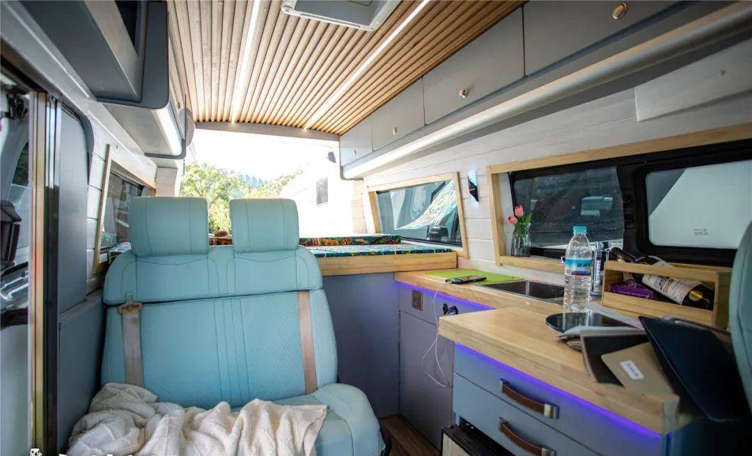 这辆车的内部色调,看起来有一种度假风格,让人心情愉悦,那是因为它用了大面积的地中海蓝色,包括主副驾驶座椅,以及客厅的卡座沙发,车内的吊柜和橱柜等都是这种浅蓝色。而浅色的木纹饰板,又在度假风中增添了自然的气息。搭配白色横条墙壁,让整辆车的内部色泽明亮轻快,一看到就会让人欢欣鼓舞。
