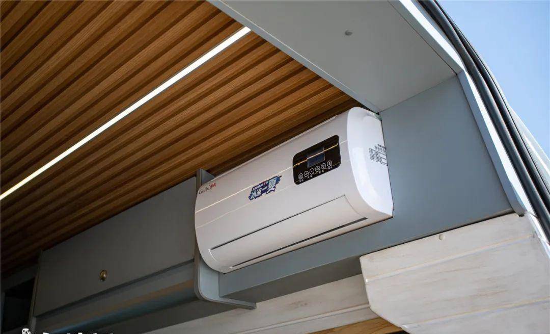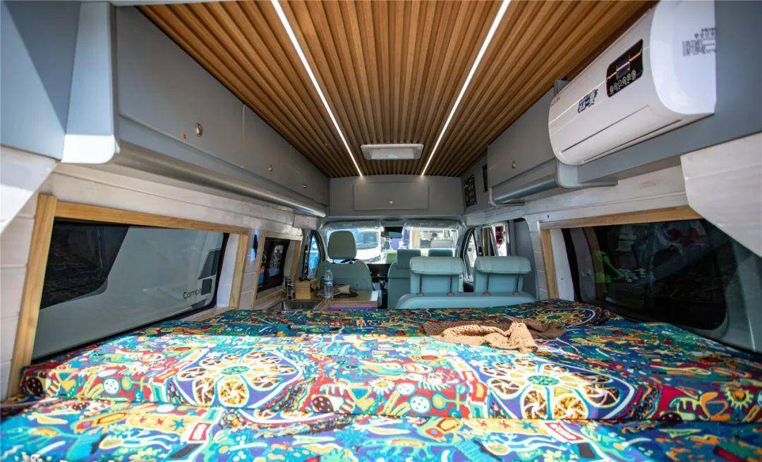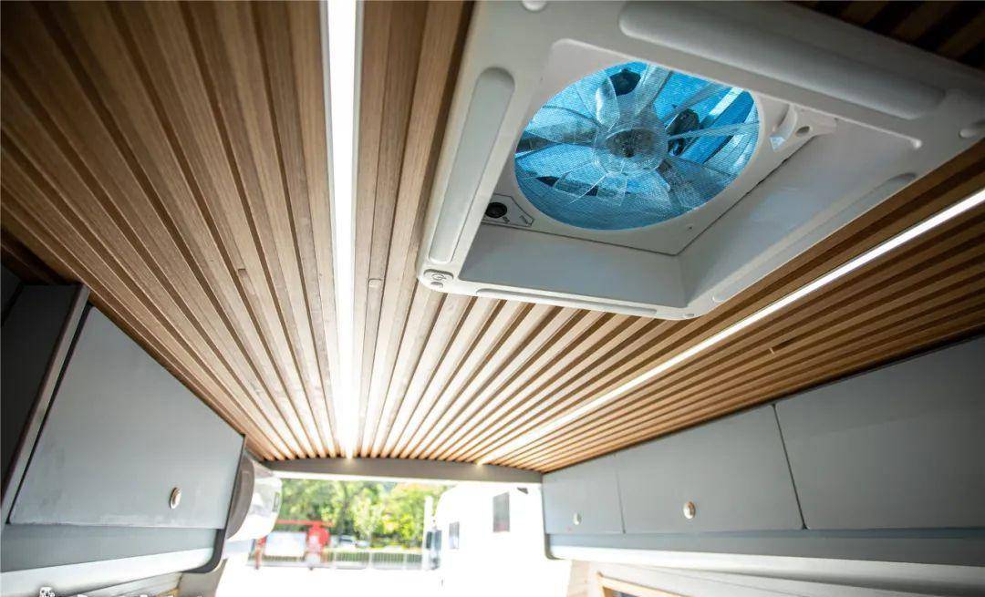 另外如果你觉得床太小,这张床还配有拓展床板,打开之后,这里就变成了一张,1.9米乘1.7米的双人床,睡卧区域上方还配有12V 变频驻车空调,睡卧区域两侧尺寸很长的两面观景窗户,这两面观景窗是固定的不能打开。顶部采用长条的木纹饰板,让整辆车内更具自然气息,车顶还配有换气扇,左右两侧都配有储物吊柜。