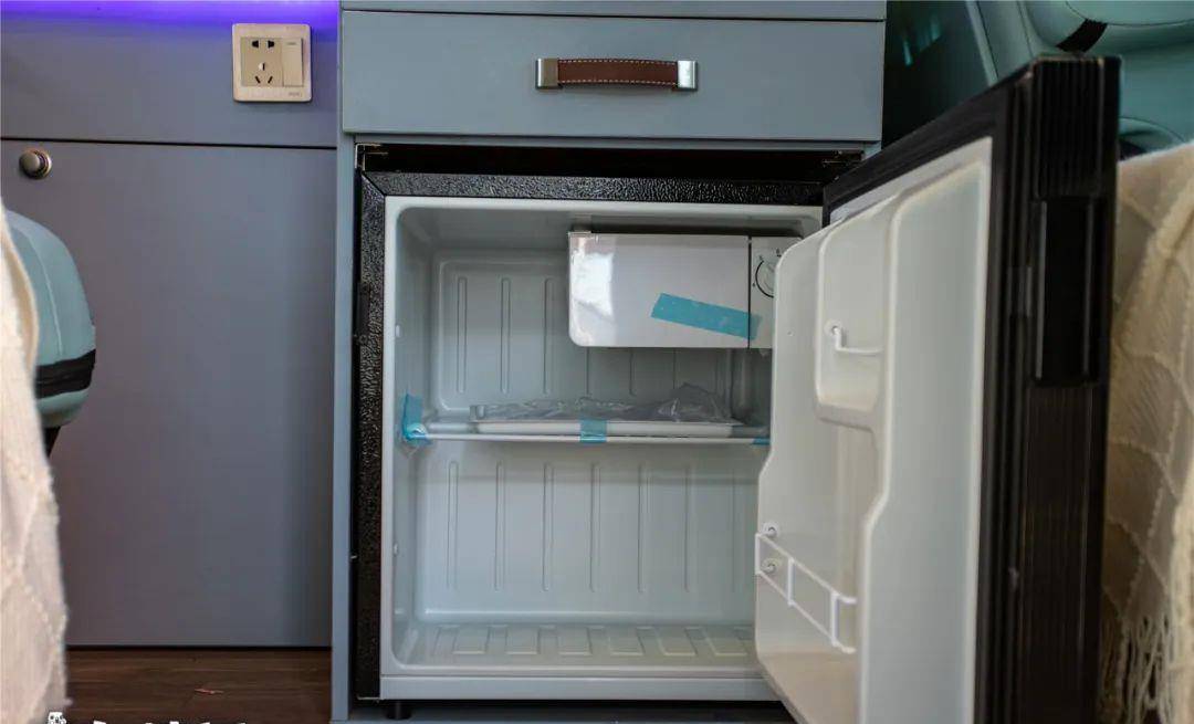 台面下方橱柜,延伸桌板下面储物抽屉,厨房区域还配备有五孔插座和USB接口,以及50L 房车专用冰箱,并且为了车辆色调的风格统一,冰箱的柜门饰板,与厨房料理台,还做了同色的木纹式样。而且我们可以看到,车窗也都做了浅色木纹的窗框,看起来十分温馨。