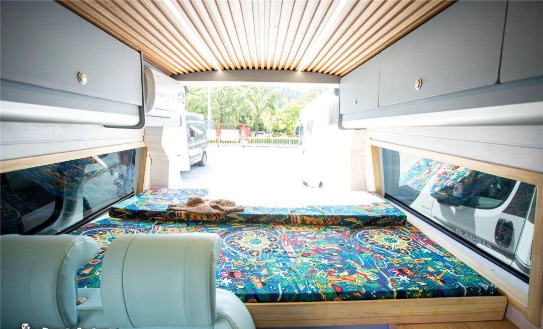 车辆尾部是后横床的位置,打开尾部双开门,躺在床上看风景,懒散的躺在风景如画的美景中,想想真是美不胜收。床下全部都是储物空间,可以放很多大件行李。