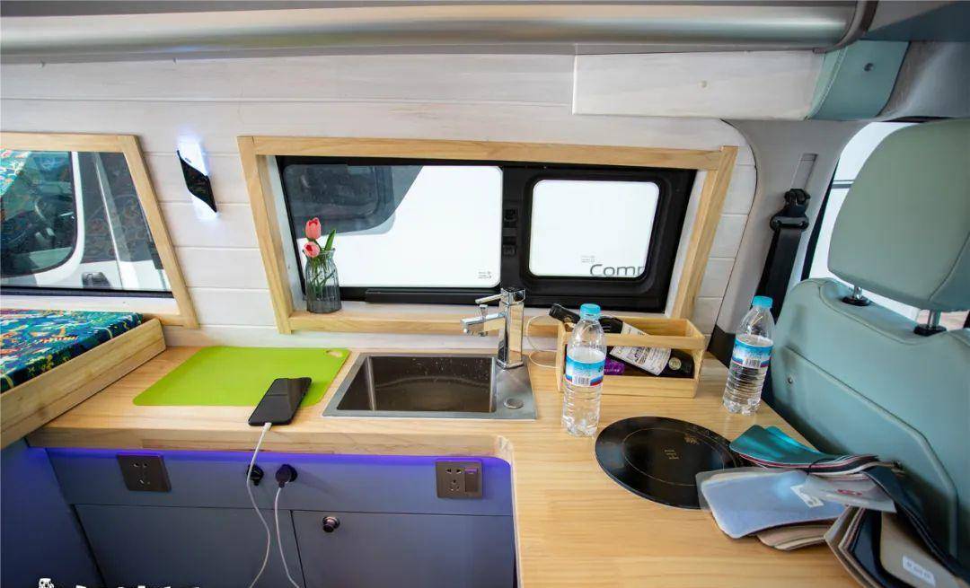 厨房区域,配备侧拉窗,行车的时候也可以打开通风,洗菜池,电磁炉,厨房的料理台是L型台面,侧边还有抽拉延伸小桌板可以扩充更大的台面空间。打开之后,还可供客厅区域卡座沙发的两人,和副驾驶的两人就餐使用。