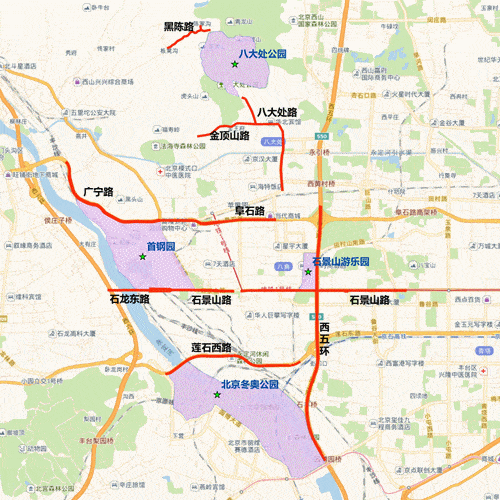 石景山区高峰时段常发严重拥堵路段主要集中在城市快速路和各主要道路。早高峰严重拥堵总里程23公里,晚高峰严重拥堵总里程15公里。具体拥堵路段预测详见下图。