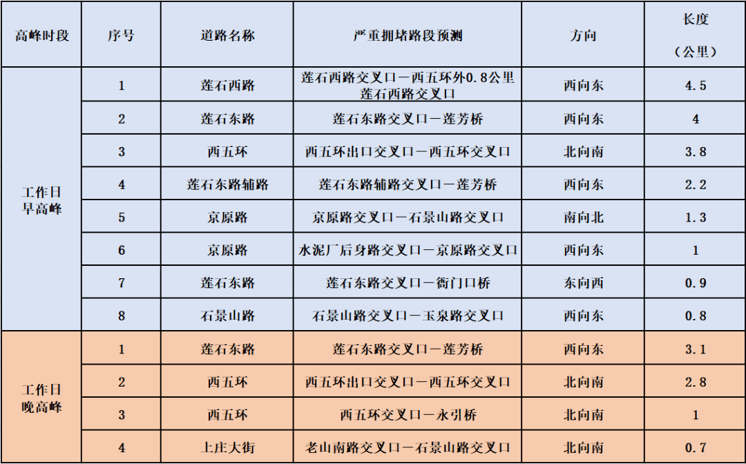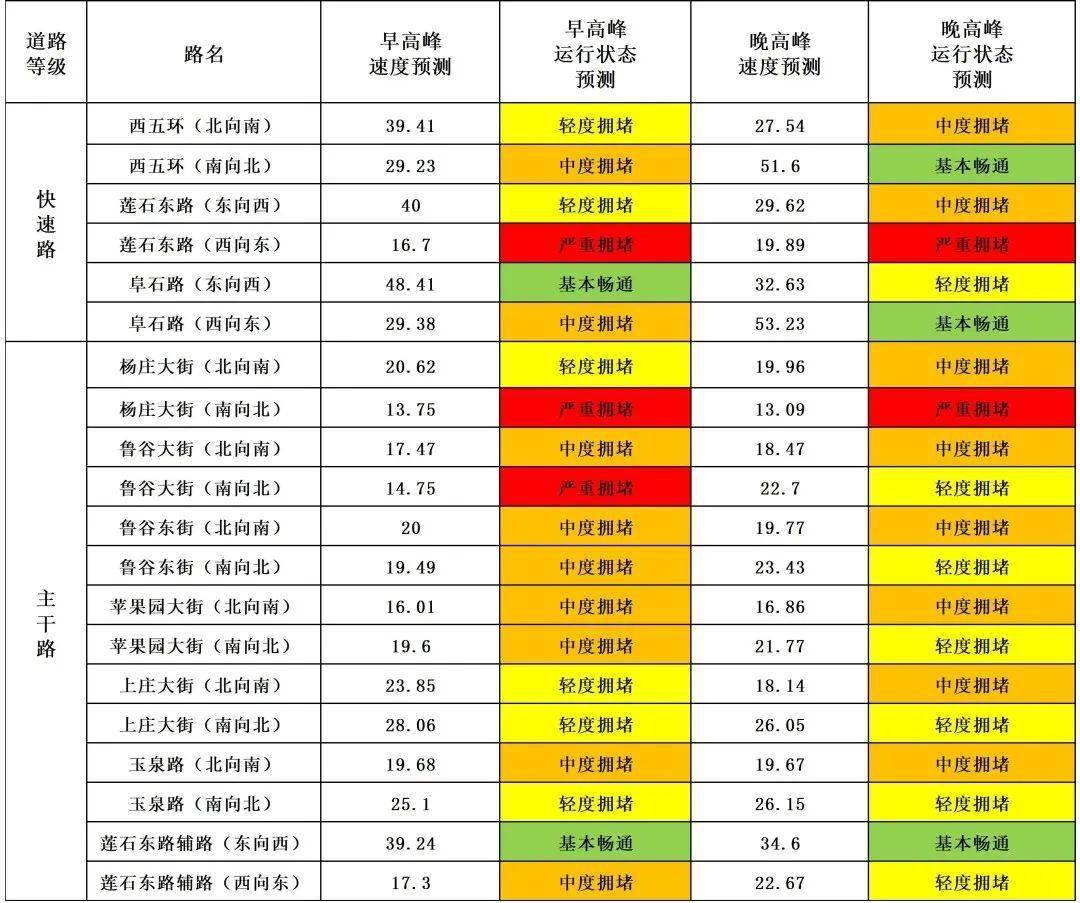 2、工作日早高峰、晚高峰时段,莲石东路、阜石路、杨庄大街、鲁谷大街等重点道路拥堵持续时间长、拥堵强度大,建议周一早高峰、周二晚高峰、周五晚高峰尽量避开高峰时段,错峰出行、绿色出行。