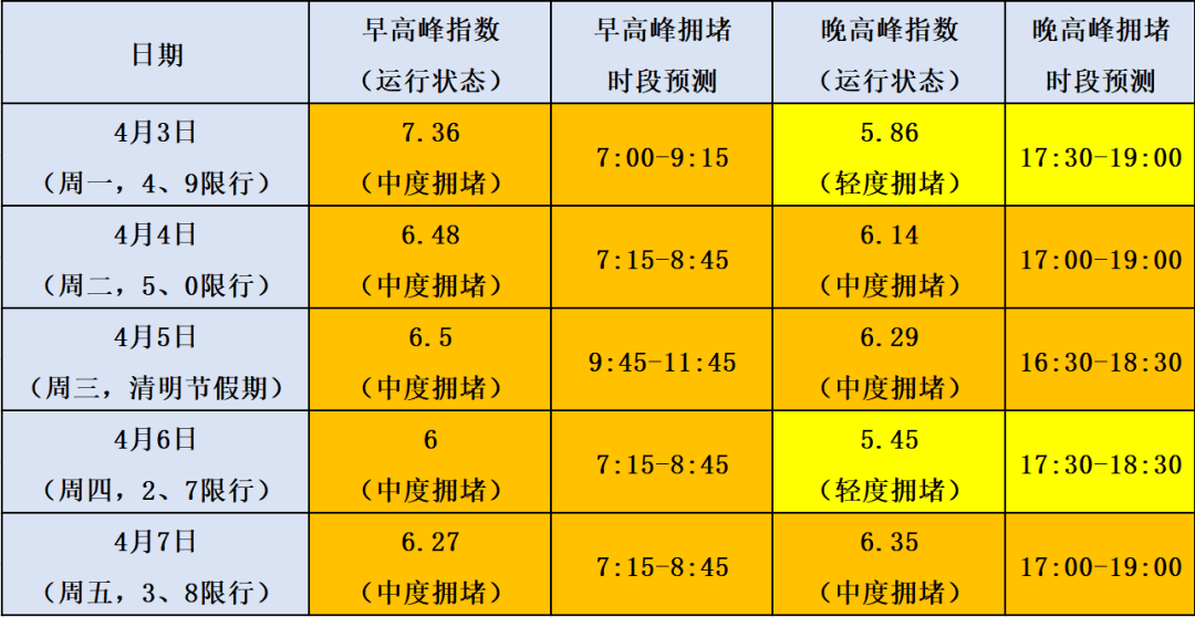 预计4月5日清明节假期高峰时段道路交通指数处于“中度拥堵”级别,交通拥堵程度高于近期周末,其中,受市民祭扫与出游活动叠加影响,早高峰时段道路交通拥堵程度高于晚高峰,上午时段中度拥堵及以上持续时间约2小时,路网基本处于“中度拥堵”水平。