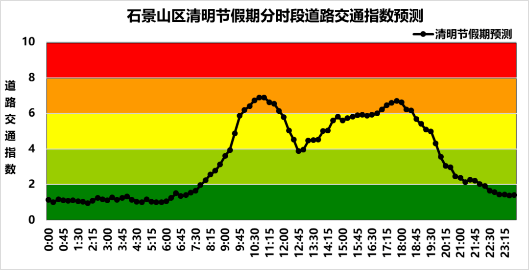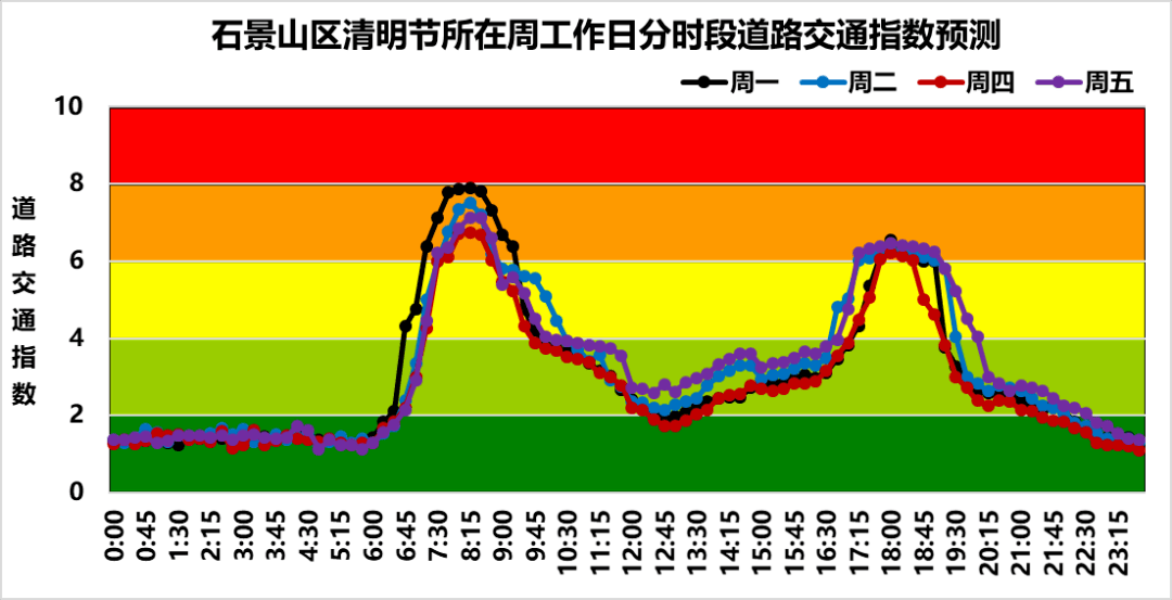 下周一4月3日起,机动车尾号限行轮换。轮换后周一限行的尾号是4和9,预计周一通勤早高峰道路拥堵情况将更加突出。下周三4月5日是清明节假期,预计假期当日扫墓出行与踏青出行需求叠加,呈现节日出行特征。结合近期及以往同期交通运行情况分析,对石景山区交通运行情况研判如下: