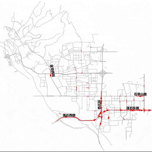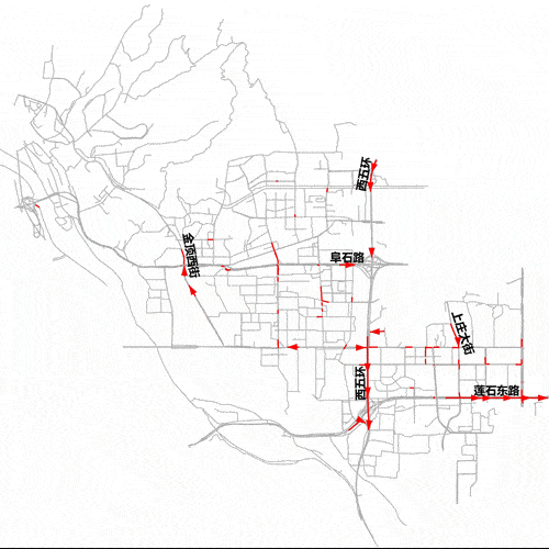 工作日早高峰时段预计有12条道路可能处于中度拥堵及以上级别,分别为:西五环(南向北)、莲石东路(西向东)、阜石路(西向东)、杨庄大街(南向北)、鲁谷大街(北向南)、鲁谷大街(南向北)、鲁谷东街(北向南)、鲁谷东街(南向北)、苹果园大街(北向南)、苹果园大街(南向北)、玉泉路(北向南)、莲石东路辅路(西向东)。