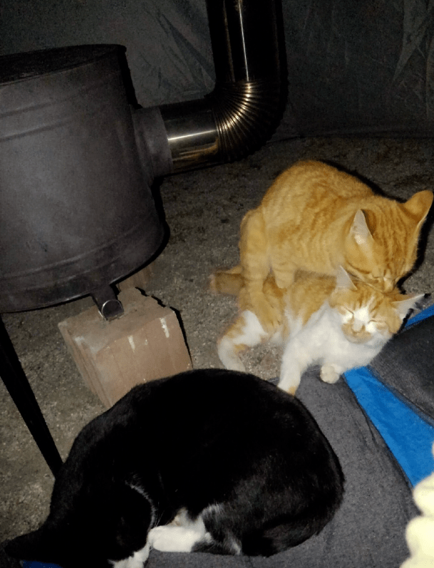 到了晚上,大家吃饱喝足了,帐篷里舒适暖和。有的猫猫开始睡觉,而有的猫猫准备开始上演激情戏码。