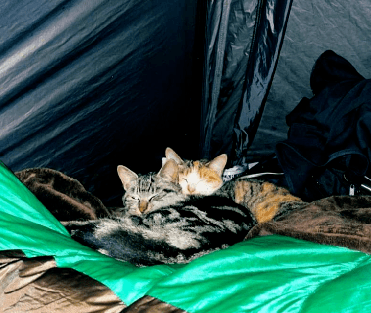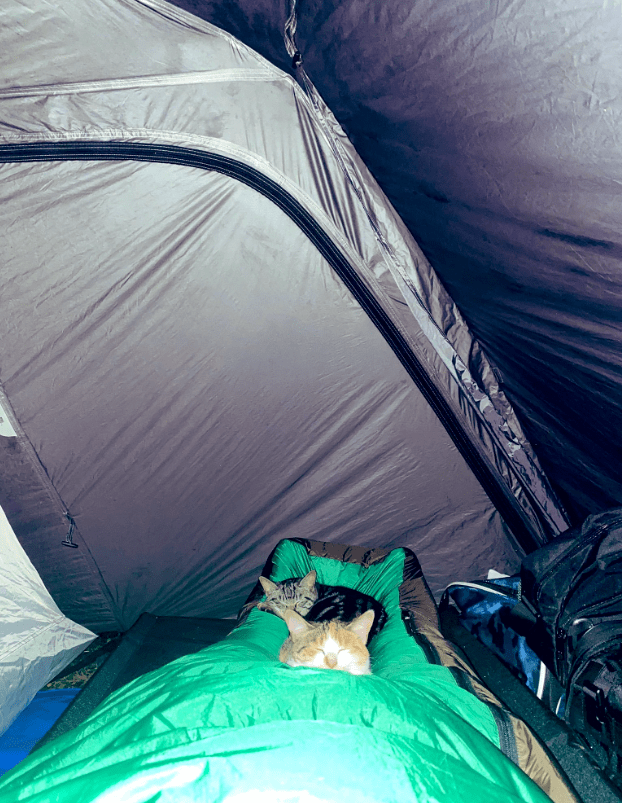 晚上,人在帐篷里睡下,猫也跟过来一起睡。