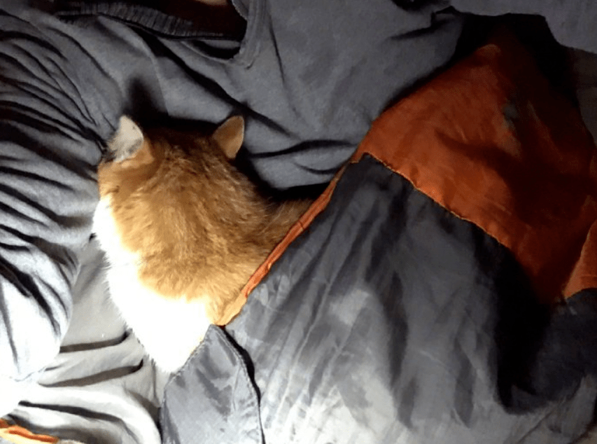 第二天醒来,网友要收拾行李,收起帐篷,猫却不愿起床。