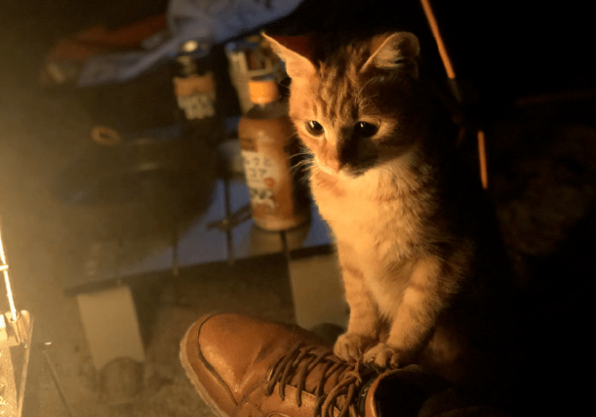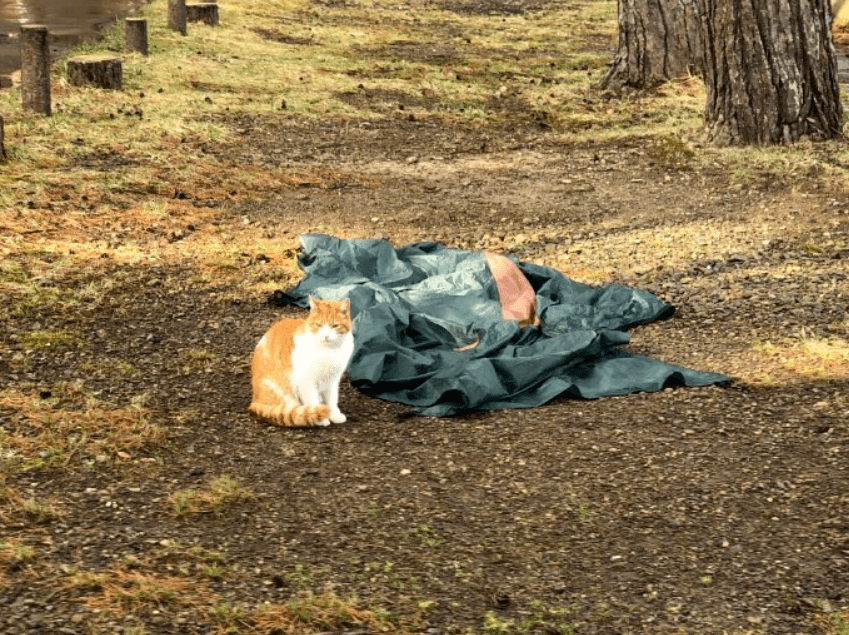 第二天,网友开始收拾帐篷,猫咪在一旁默默地看着。
