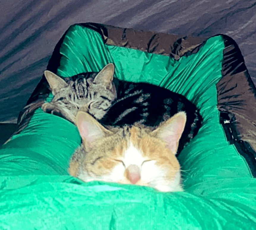 帐篷搭好了,猫猫势力迅速占领,抢占最舒服的位置。