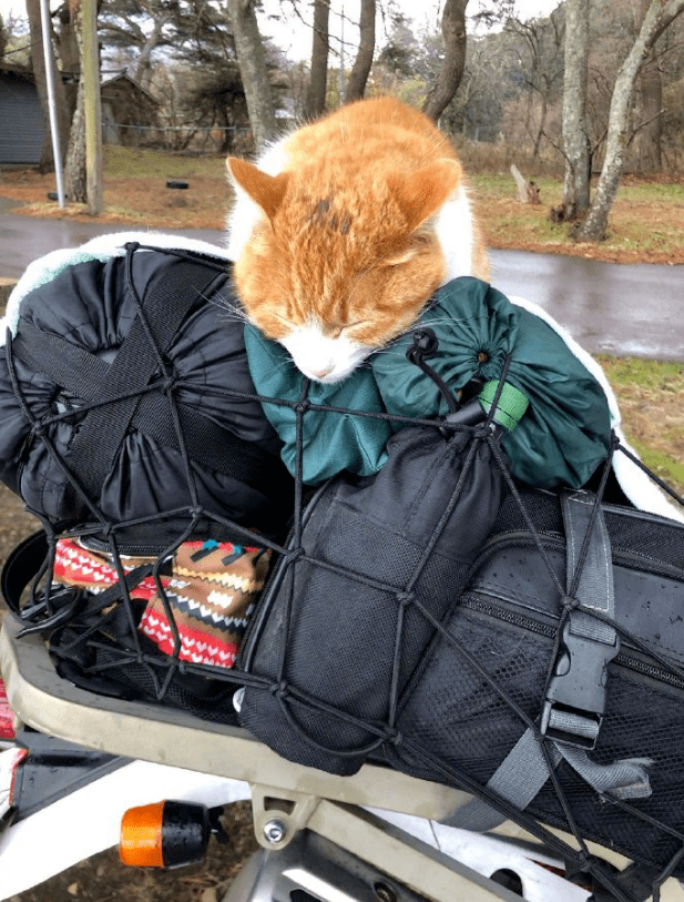 等把所有的东西打包好,并绑到车上后,猫咪也跟到了行李上。