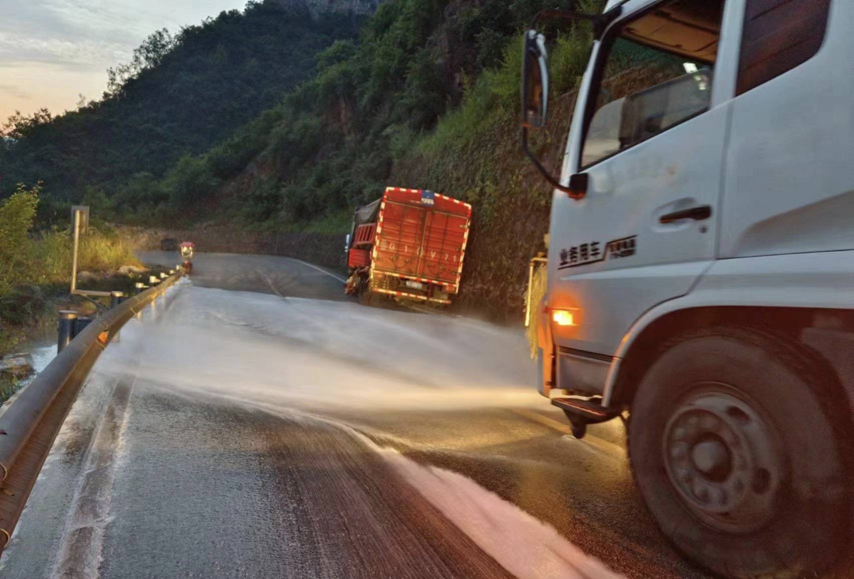 凌晨1点,工作人员在事故道路两端设置好警示标志后,借助车灯,对散落路面的破碎瓦片予以清理,至凌晨3点,事故路段清障作业完毕。随后,经过从沐抚办事处先行调用的小水车和该局加派赶到的水车先后两次对该路段油污进行强力冲洗后,油污彻底无残留,至凌晨5点40分,道路全面恢复干净、畅通。