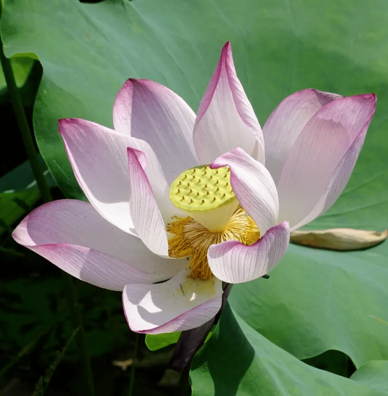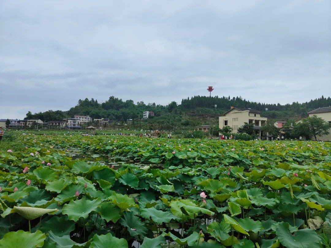 俯瞰山下的荷月江岸,芙蕖正艳。荷田郁郁葱葱,团团圆圆的叶片拱卫着粉嫩的花朵,微风乍起,花枝摇曳,煞是好看。