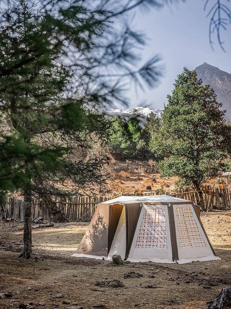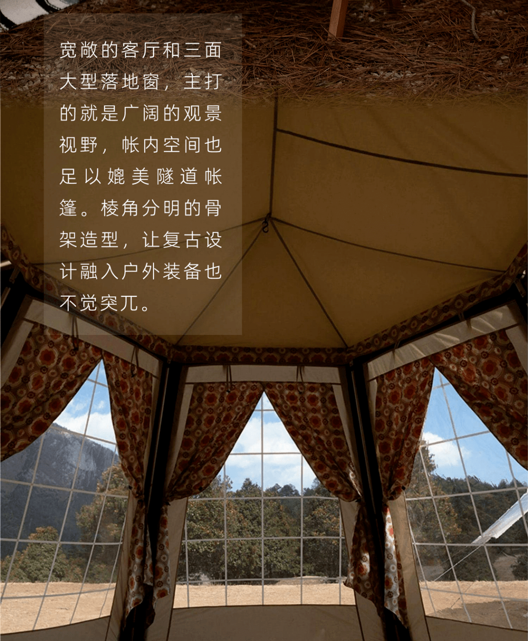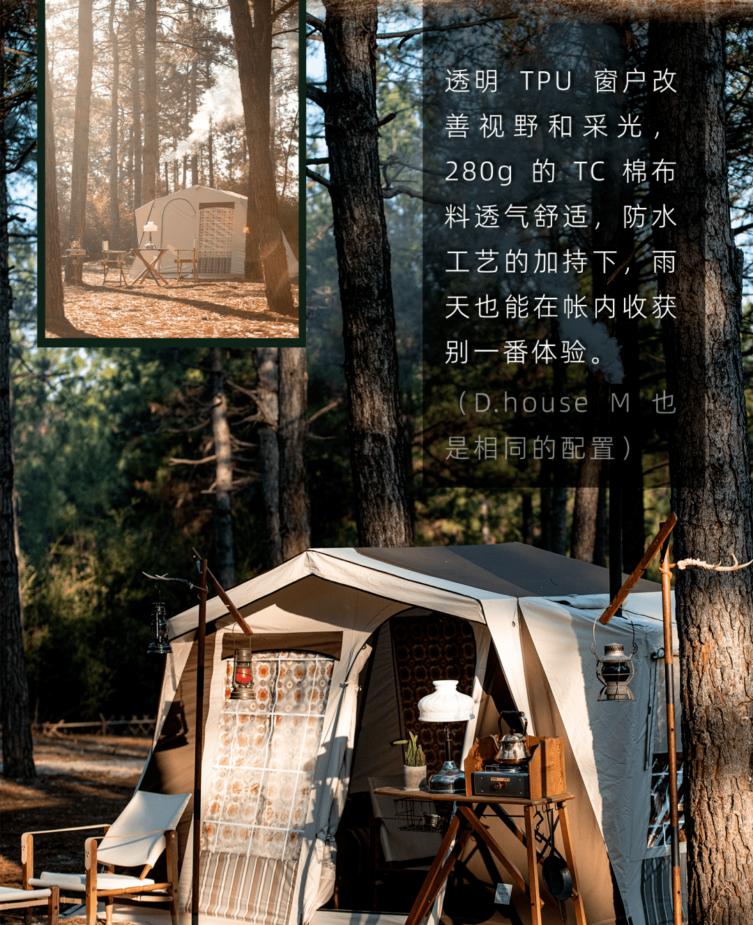 如果说刚才的 D.house M 是简单直接的观景体验,那这款灵感来源于上世纪 40 年代法式帐篷的 D.house S,则是细腻雅致一些的田园生活感。