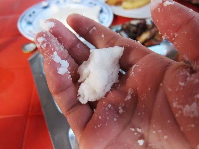 用手抓一把后揉成一个球,感觉好像在吃印度菜的感觉,哈哈。说实在的这些东西并不怎么好吃,但是能够参观当地人的小镇,品尝到当地人日常吃的东西,还是非常满意的。