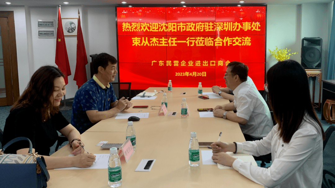 2023年4月24日上午,广东民营企业进出口商会会长高飞在商会会议厅,举行了对沈阳市政府驻深圳办事处束从杰主任一行的欢迎仪式,广东省跨境商品贸易协会会长徐涛受邀出席,共同探讨沈阳市与广东的经济交流合作。