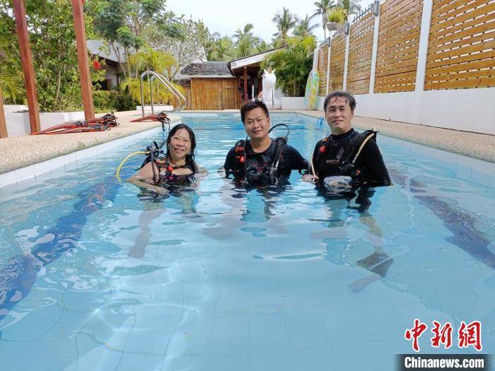 2022年11月,陈守忠(右一)与太太在菲律宾学习潜水。(受访者供图)