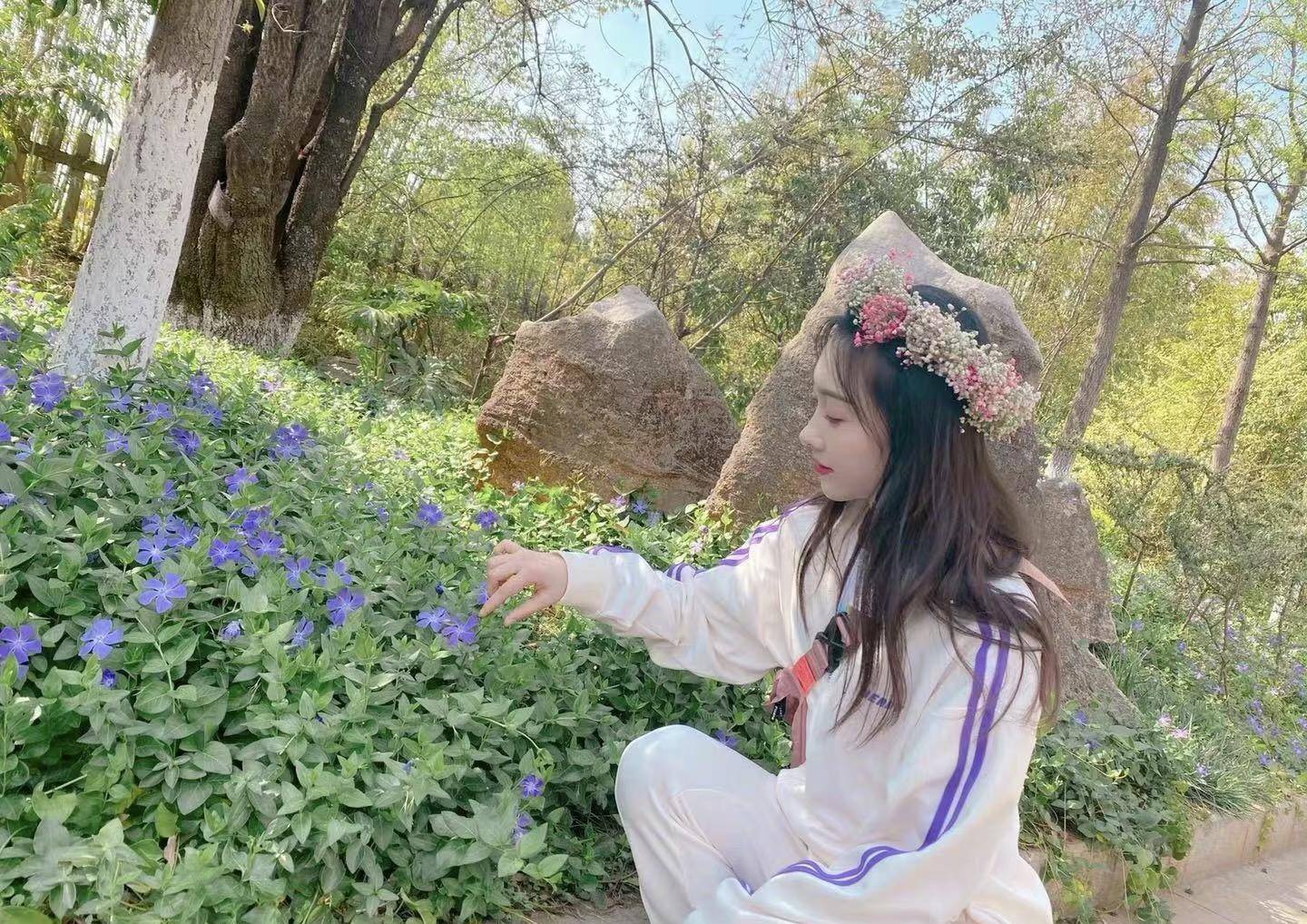 照片当中的宣璐身穿紫色条纹运动衣,他的长相非常干净清纯,所以很适合浅色运动服,而且因为练习舞蹈的原因她的身材高挑纤瘦,运动服也遮挡不住她的身线。披肩长发搭配惹眼的花环,果然是充满少女心的女生。