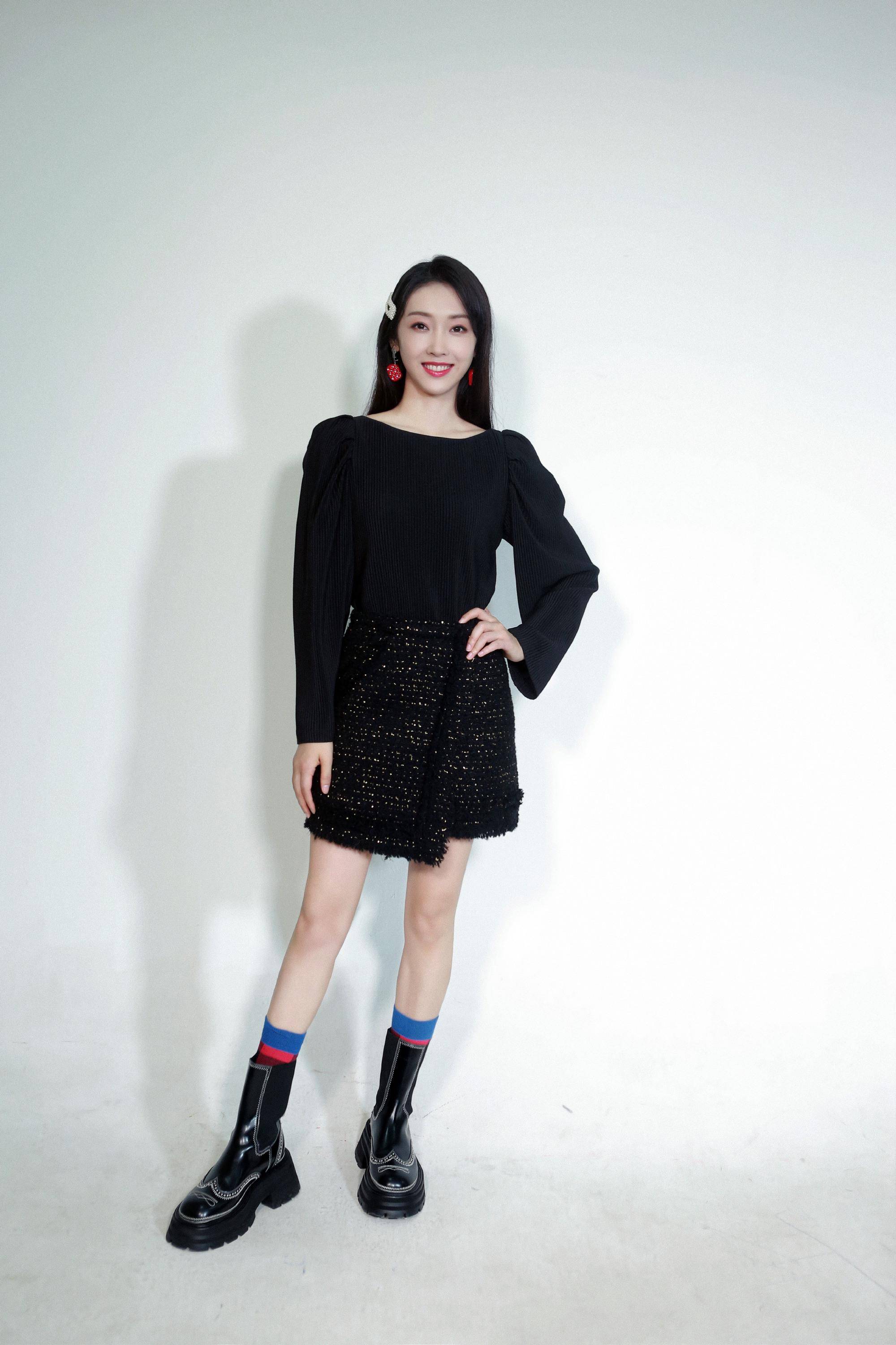 这套穿搭看起来依旧很有少女感,而且颜色搭配更加简单高级。身穿宽松的黑色长袖上衣和黑色高腰包臀短裙,本身这样的穿搭已经很显身材,但是裙子上面的亮片丝线点缀才是最大的亮点。条纹高筒袜搭配黑色烟筒靴,笑容甜美精致。