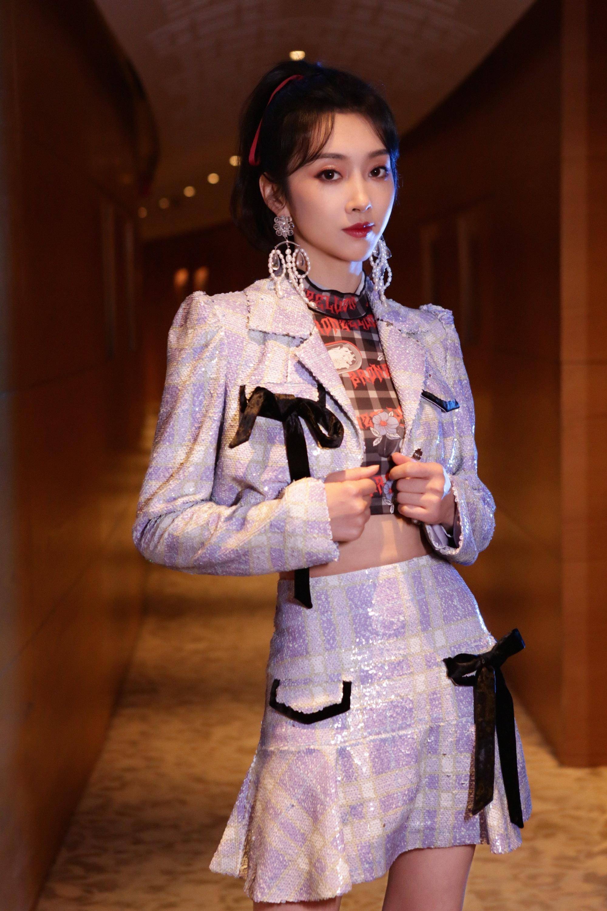 大家可以对比一下宣璐平时的穿搭风格,相比出门旅行的运动风来说,参加活动的宣璐更擅长一些显身材的服装,比如这款类似于JK制服的格纹套裙。JK制服会达到清纯少女感的效果,她的内搭是一款漏气花衬衫,搭配紫色薰衣草格纹套裙,裙子上面的黑色蝴蝶结设计是最大的亮点,点缀其中更有少女心。