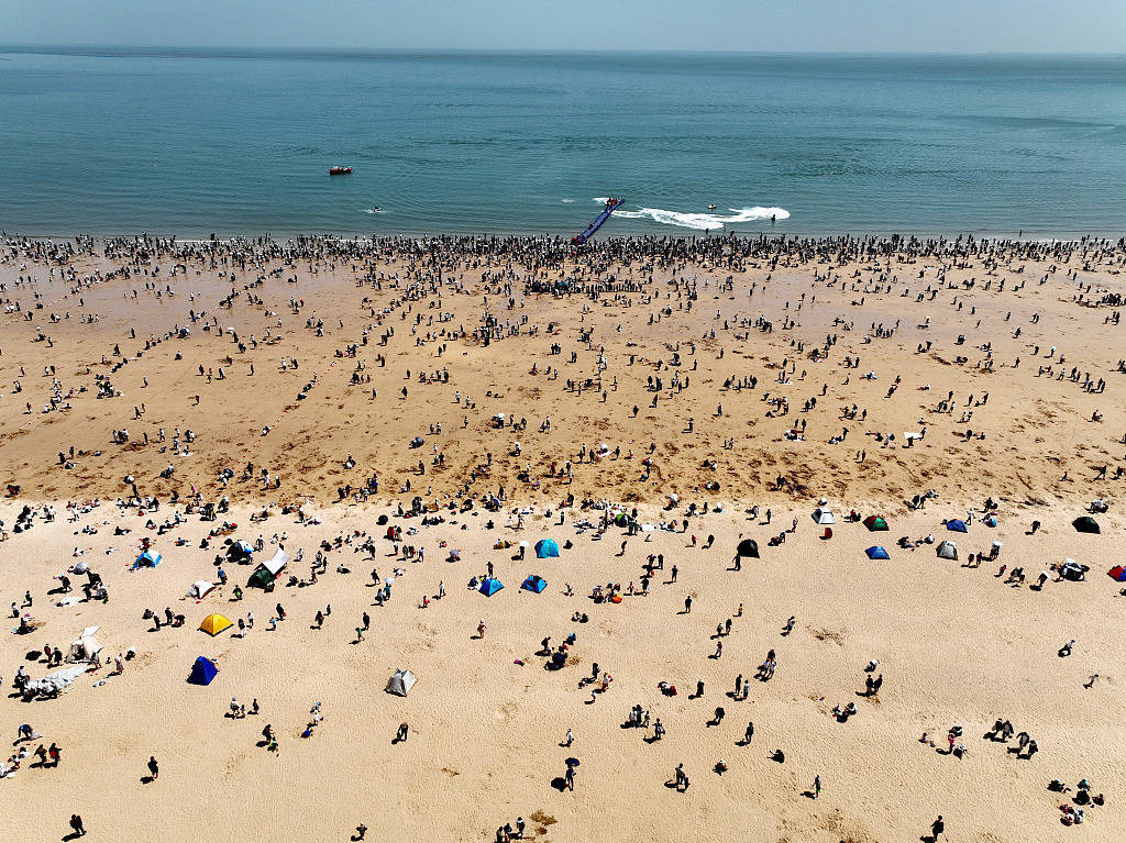 2023年5月1日,江苏省连云港市,连云区连岛大沙湾游乐园海滨浴场,游客尽情游玩。视觉中国 资料图