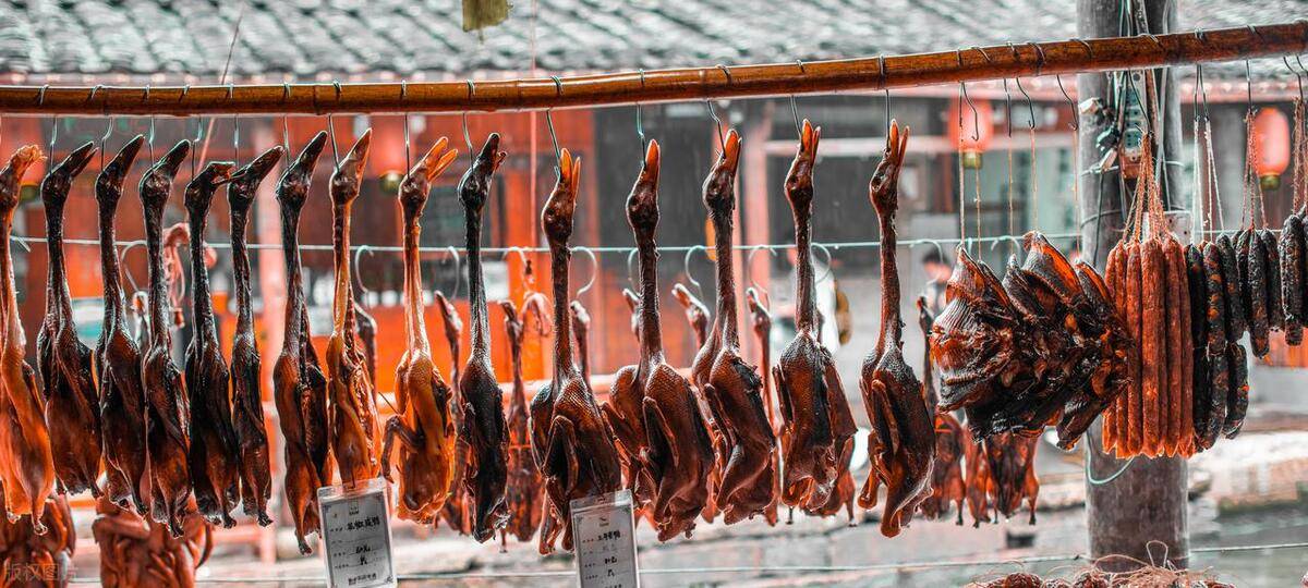“两岸人家安且昌,乌篷俨在画中航。腊肠鱼鲞梅干熟,黄酒白糖蚕豆香。”。这是一个安逸舒适,风景如画的小镇。老街,依河而建,南边是民居,北边是商市,各式酱鸭腊肠,整整齐齐的挂在河边的架子上。