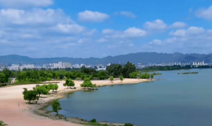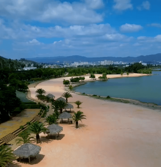 蓝天白云、沙滩、棕榈树、茅草屋,踩着软软的细沙悠闲漫步,迎面不时吹来湿润的微风,宽阔的水面涟漪追赶着风,悠悠摆动……此情此景,你以为是大海边?其实不是哦,这些沙滩美景在昆明滇池南岸沙滩主题公园就可以看到。
