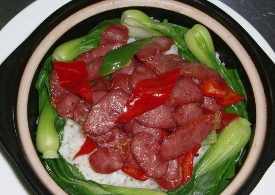首先准备材料:大米,胡萝卜,土豆,腊肠,藕,洋葱,香菜。大米先用清水洗过后放入电饭锅,加水末过米2~3cm接上电源正常煮饭,红萝卜、土豆、莲藕分别切条土豆和莲藕切条后过水去掉淀粉,洋葱随意切三角形块,腊肠切片香菜切段备用,锅烧热后加少许油倒入腊肠小火慢慢翻炒出香味,加入红萝卜条、土豆条、莲藕条一起翻炒全部炒匀后加少许盐继续翻炒,待所有菜炒至八成熟时加入洋葱翻炒几下关火备用,电饭锅中饭煮至听不到水声时,将炒好的菜倒入电饭锅里继续煮直至电饭锅自动跳到保温位置关掉电源,关掉电源等2~3分钟后,打开电饭锅锅盖,滴几滴香油,撒上香菜,然后将饭和菜拌均匀一道美味的煲仔饭就呈现在你眼前。