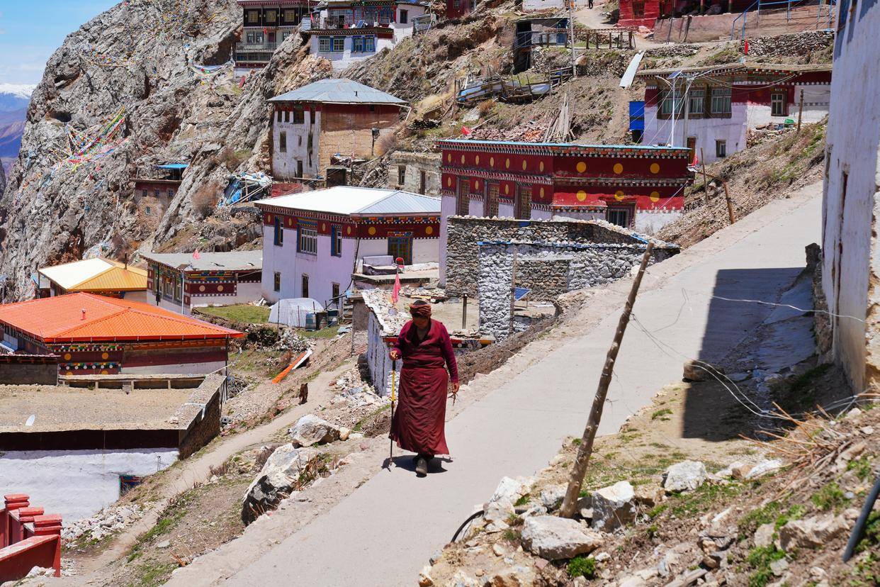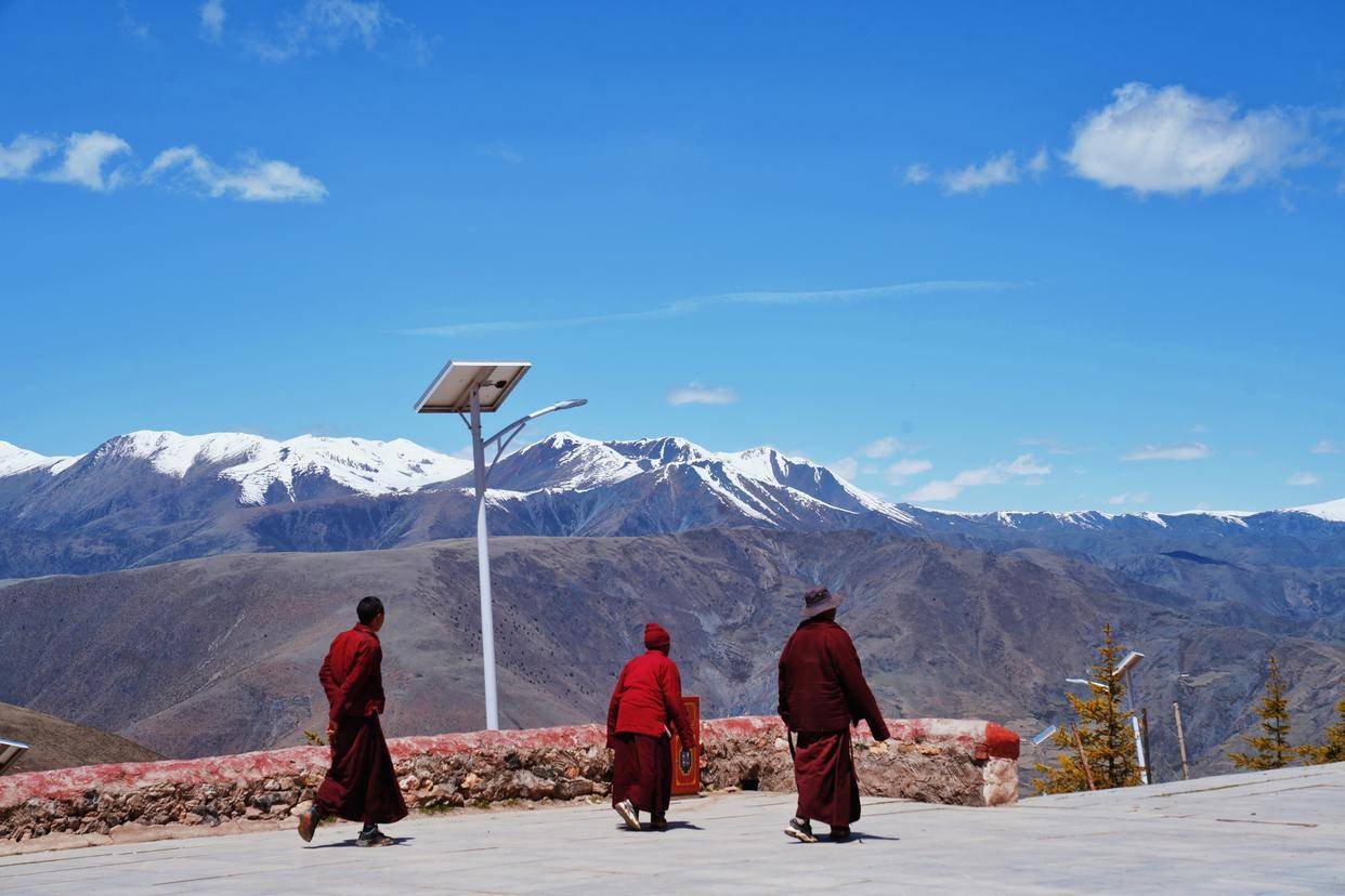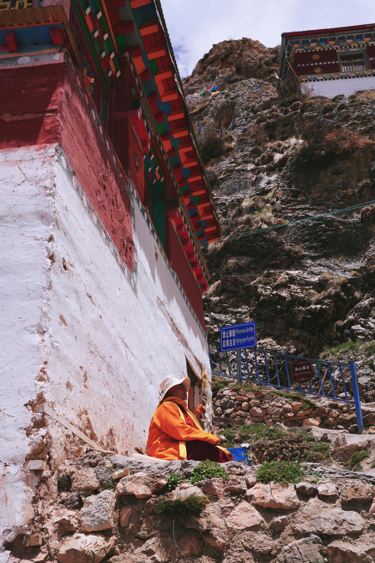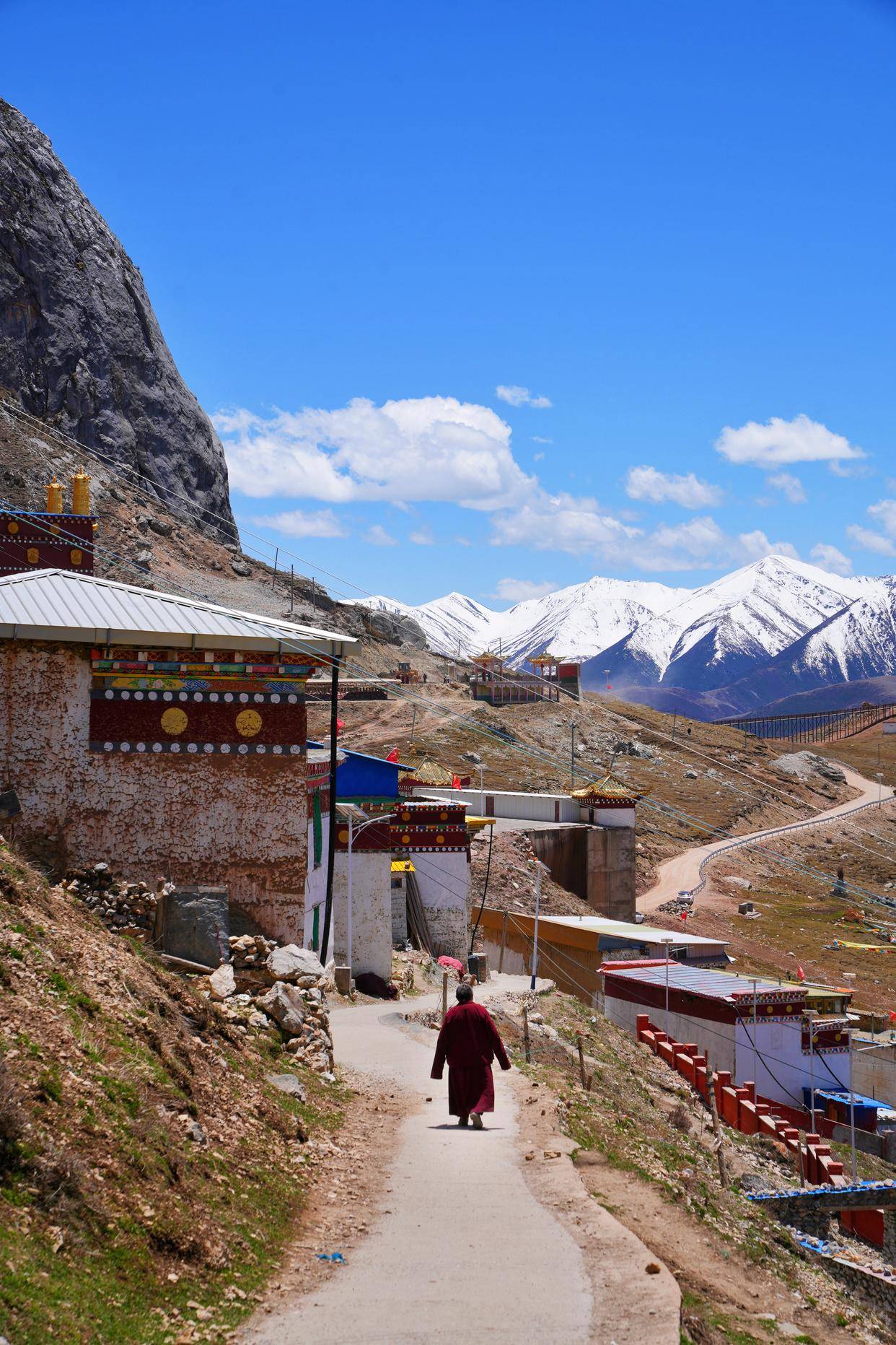 我上山的途中,遇到了一个修行的老者,坐在安静的一隅,面对辽阔的蓝天,静默的凝望着, 孜珠寺由于地处海拔4800米的雪山上,我来的时候是初夏,温度不算很冷,到了冬天下雪季节,寒冷、高海波等因素的影响,孜珠寺的自然条 极为艰苦,僧人是在非常艰苦的情况下修炼本教的佛法,需要极大的耐心和坚持。